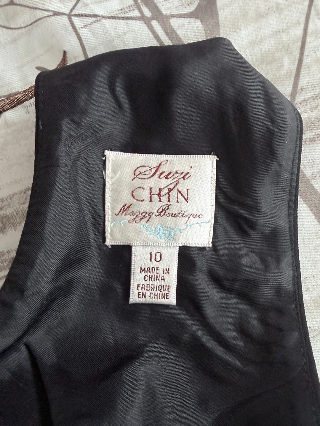 This is a black cap sleeve dress from Suzi Chin Maggy Boutique. It's a size 10 and made in China. The fabric appears to be a blend suitable for a formal or business casual occasion.