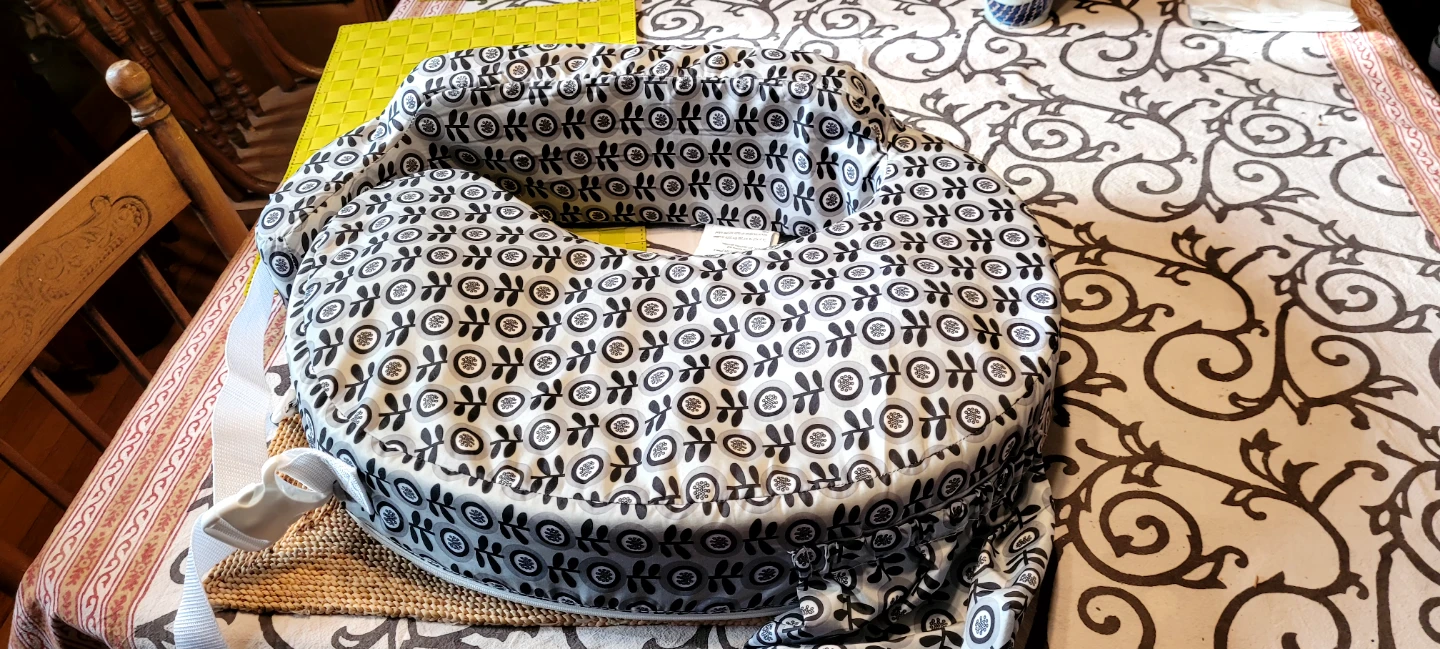 This is a My Brest Friend nursing pillow. It has a unique wrap-around design for comfortable feeding. The cover features a black and white floral pattern.