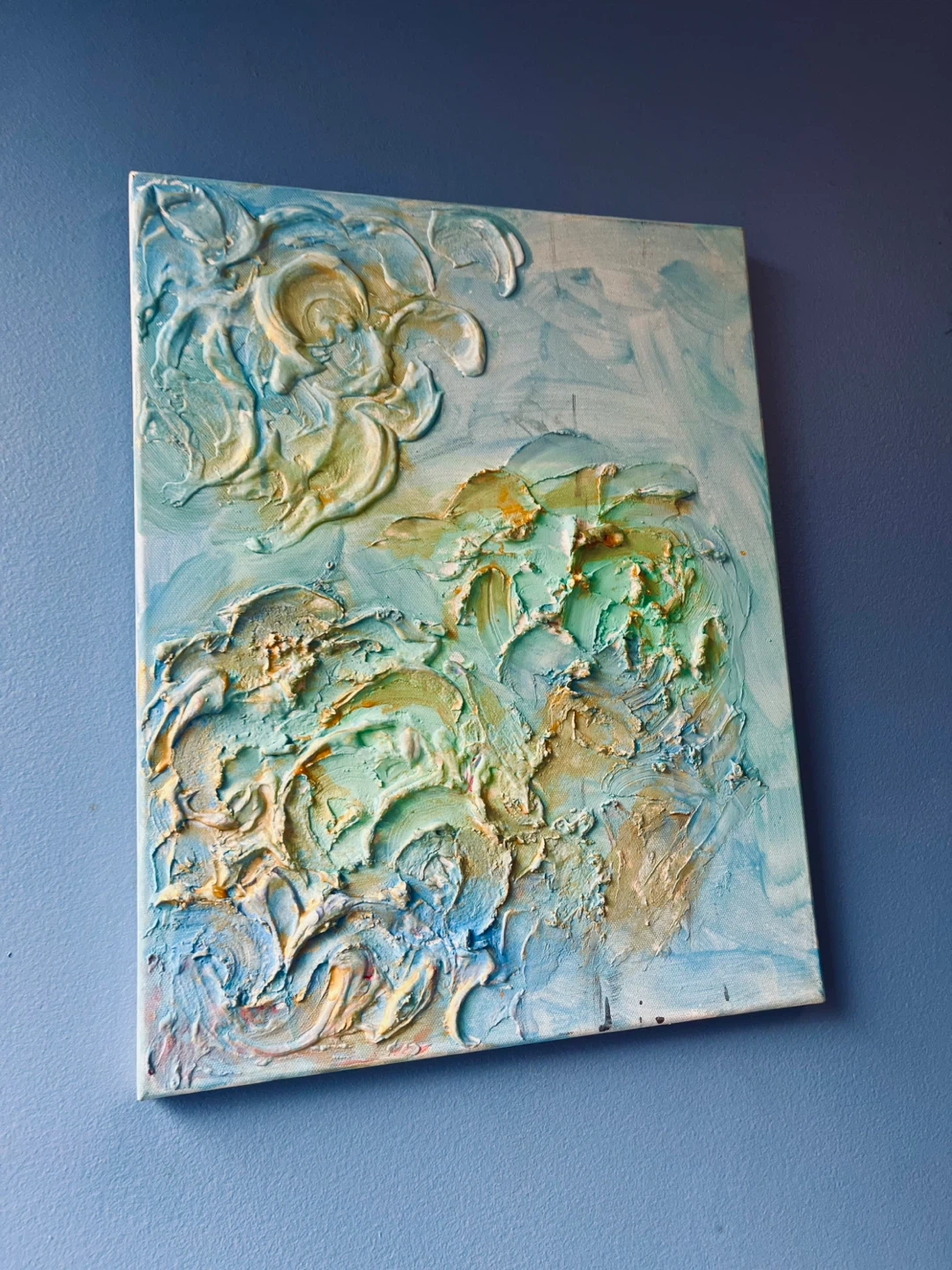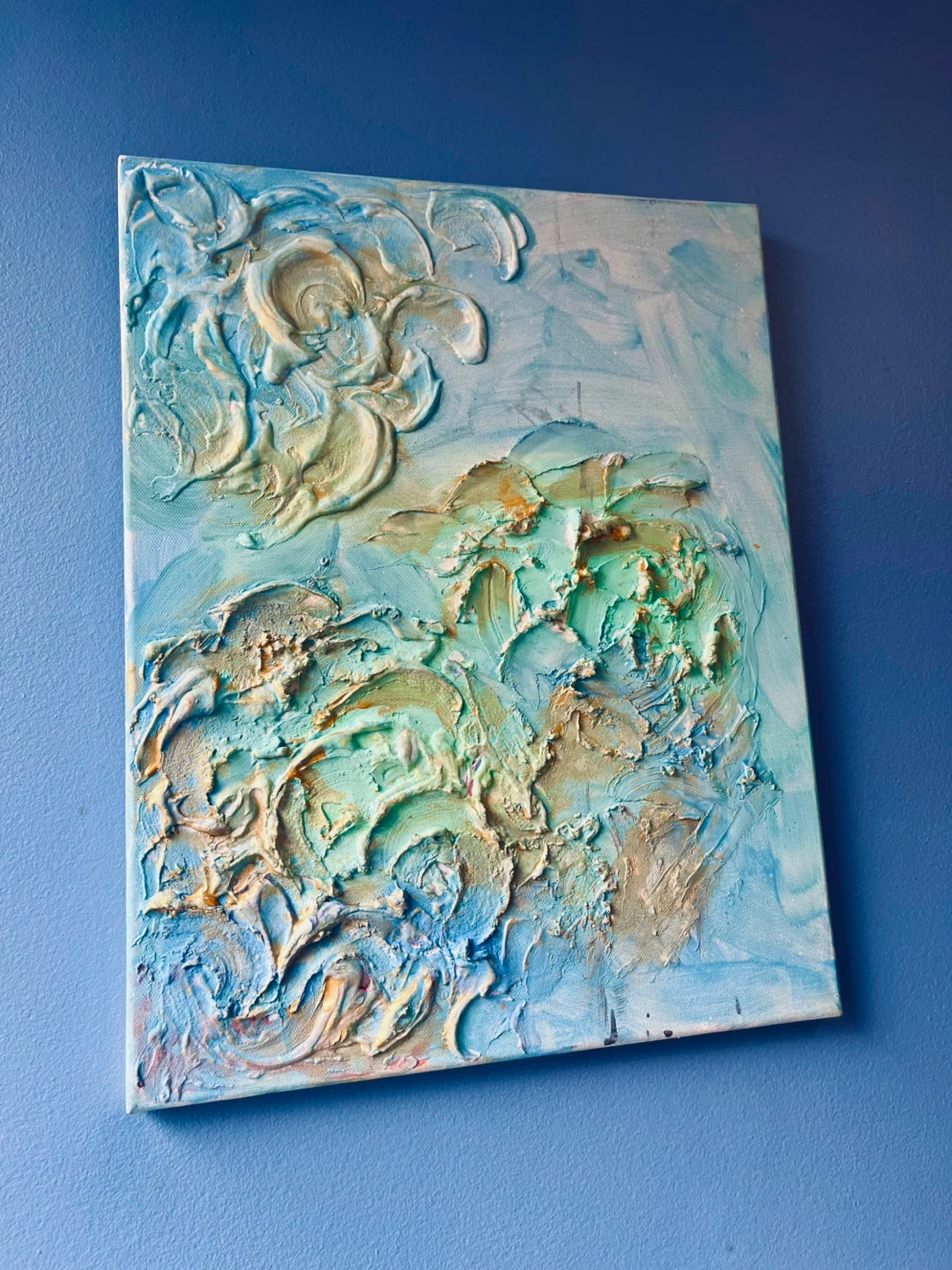 Textured abstract art piece with pastel blue, teal, and gold accents. Heavy impasto technique used for a rich, dimensional effect. Canvas measures approximately 12x16 inches.