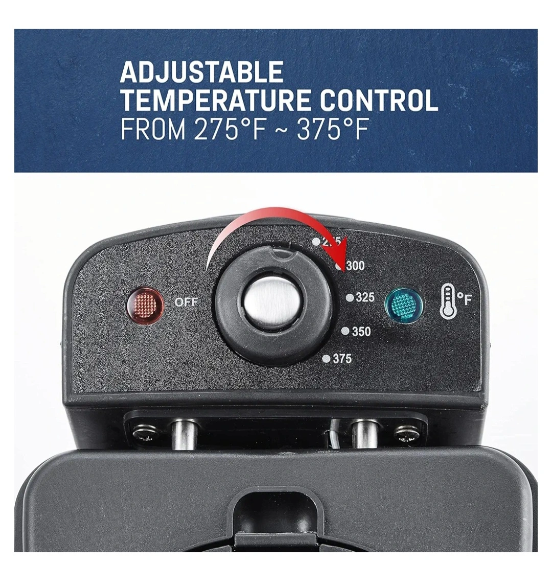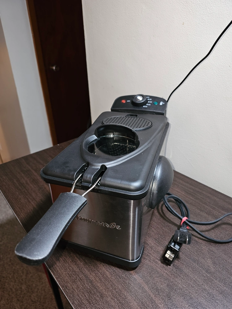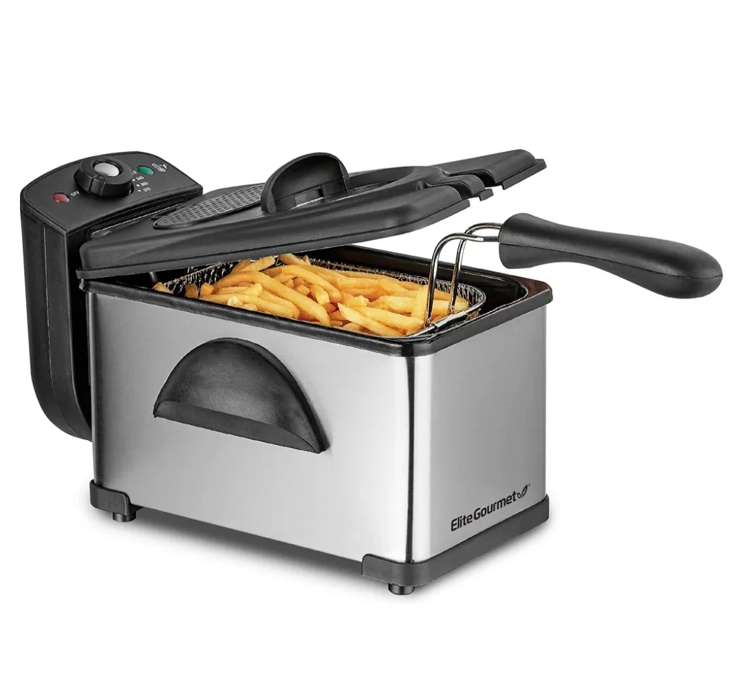 Stainless steel electric deep fryer. Includes a removable basket, lid and cord. Adjustable temperature control.