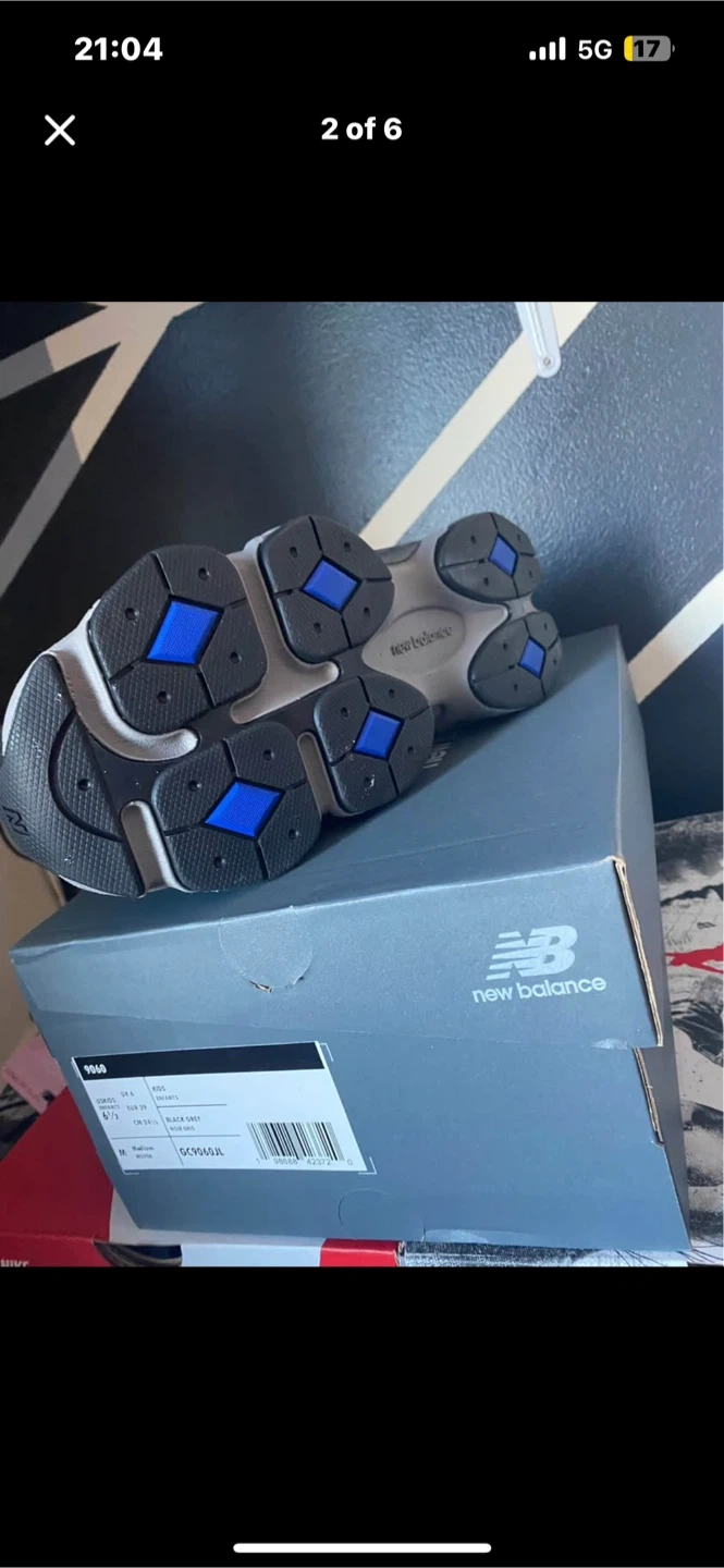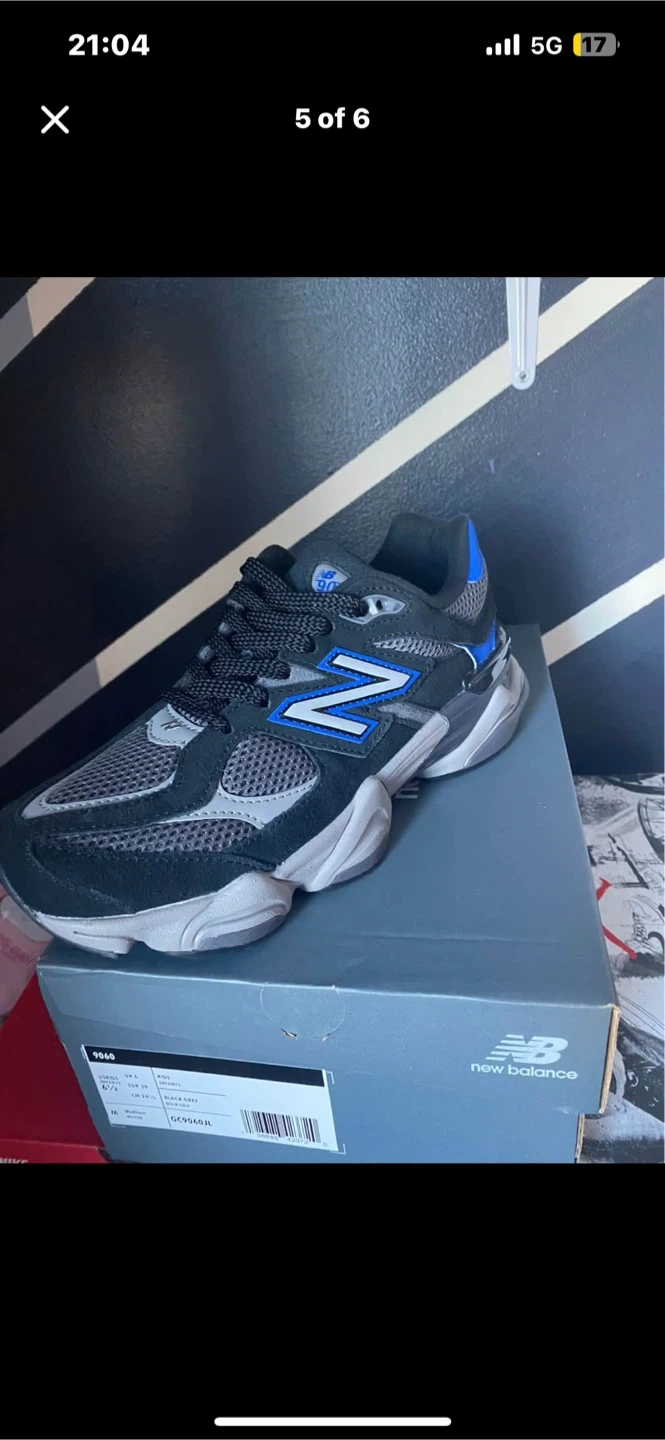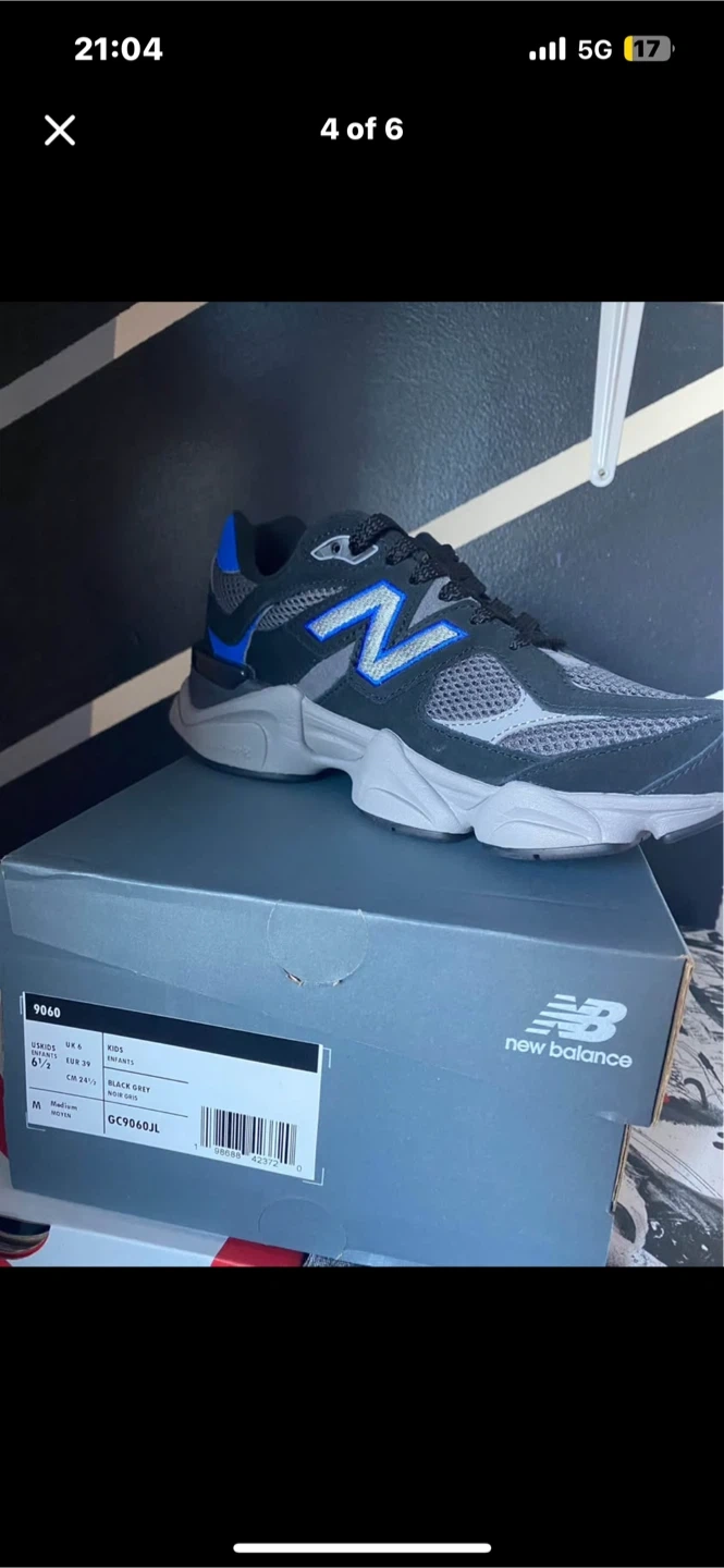 Selling a pair of New Balance 9060 sneakers in black and grey for kids! The size is 6.5 (US Kids). Comes with the original box