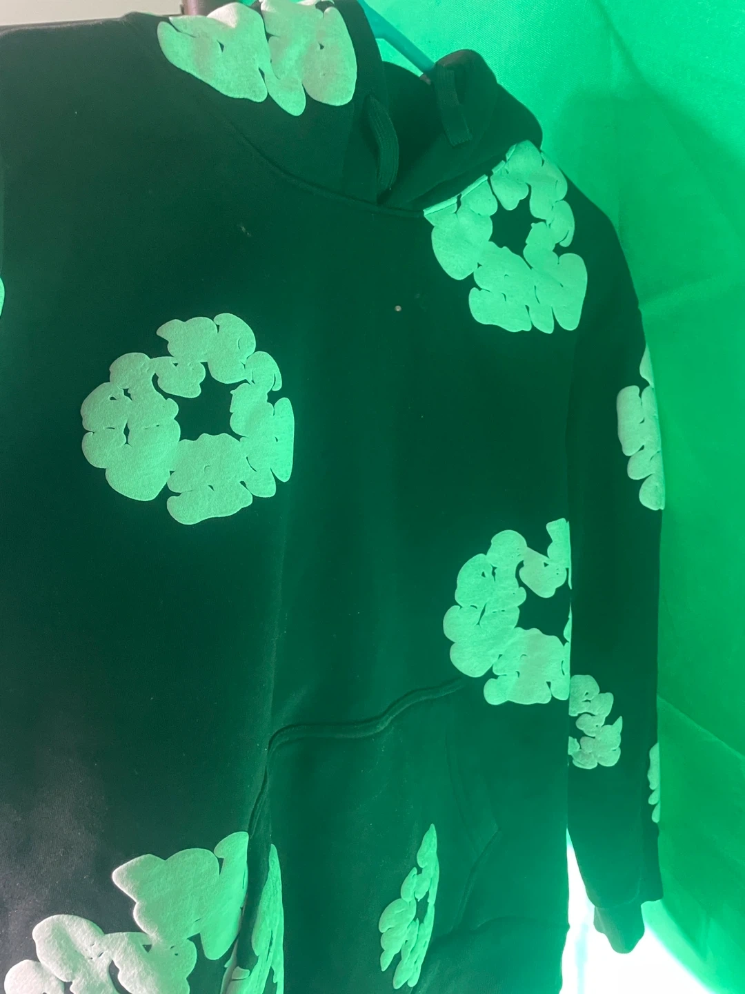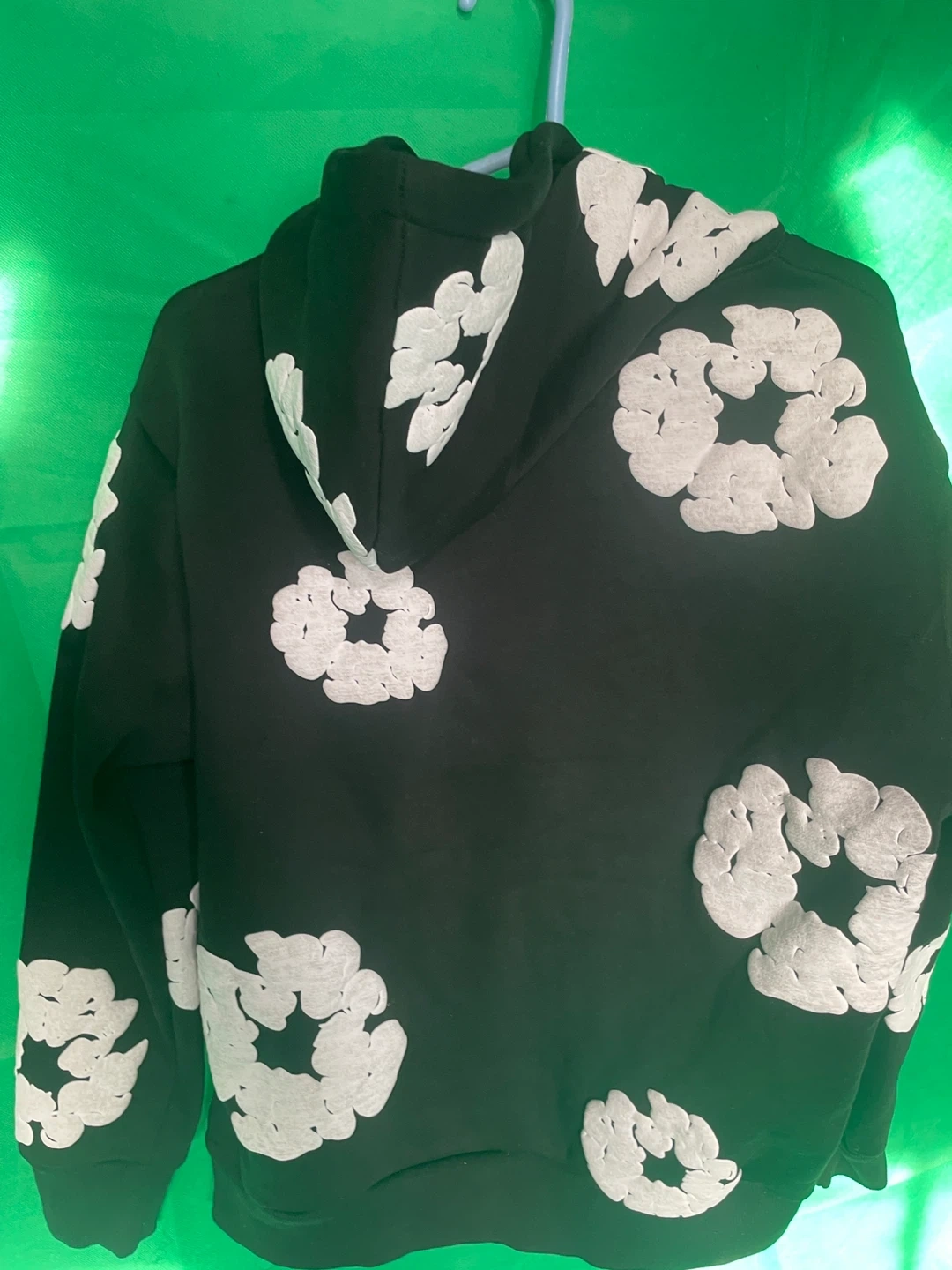 Denim Tears African Diaspora Goods hoodie in black. Features a repeating white floral graphic print. Size medium.