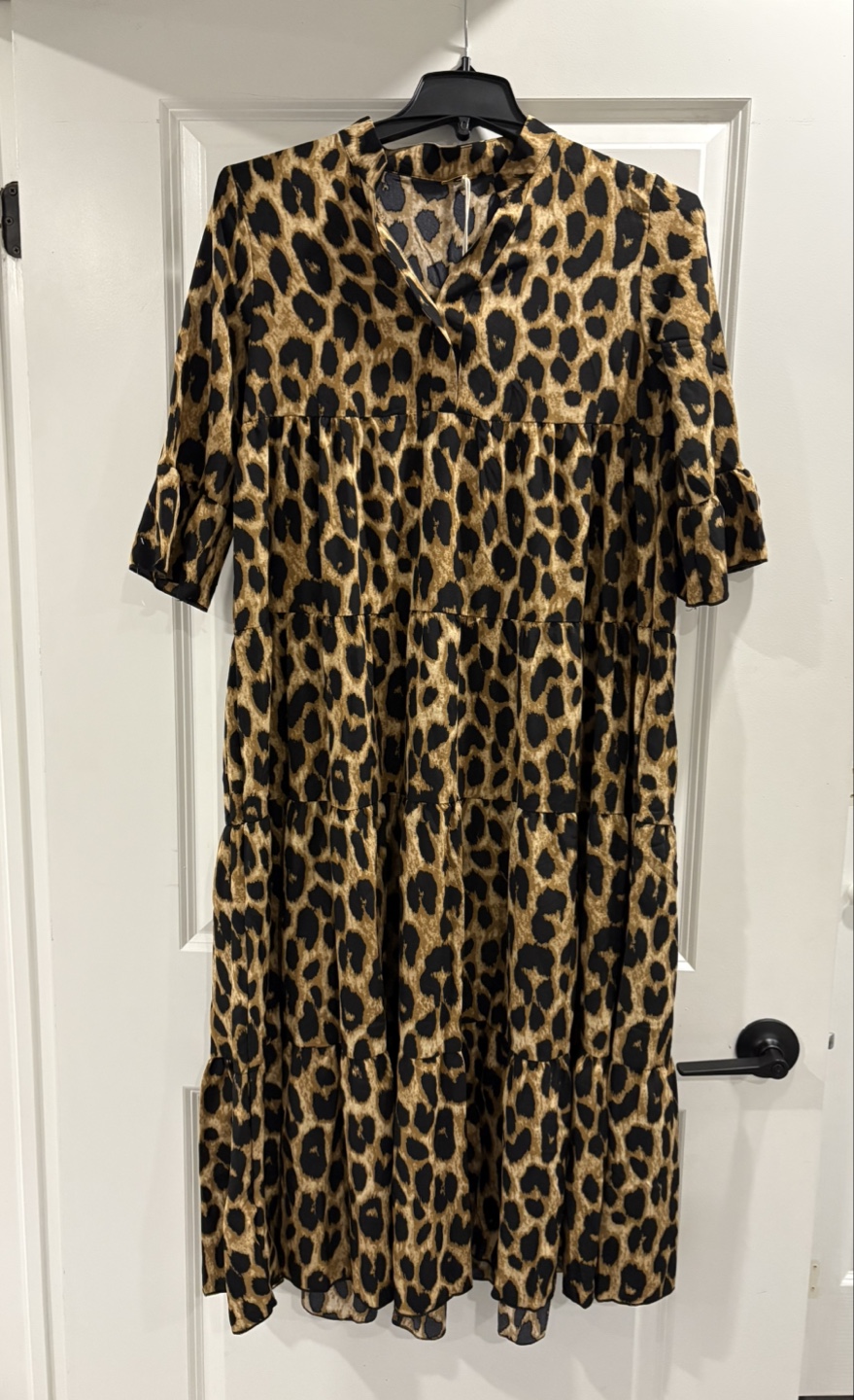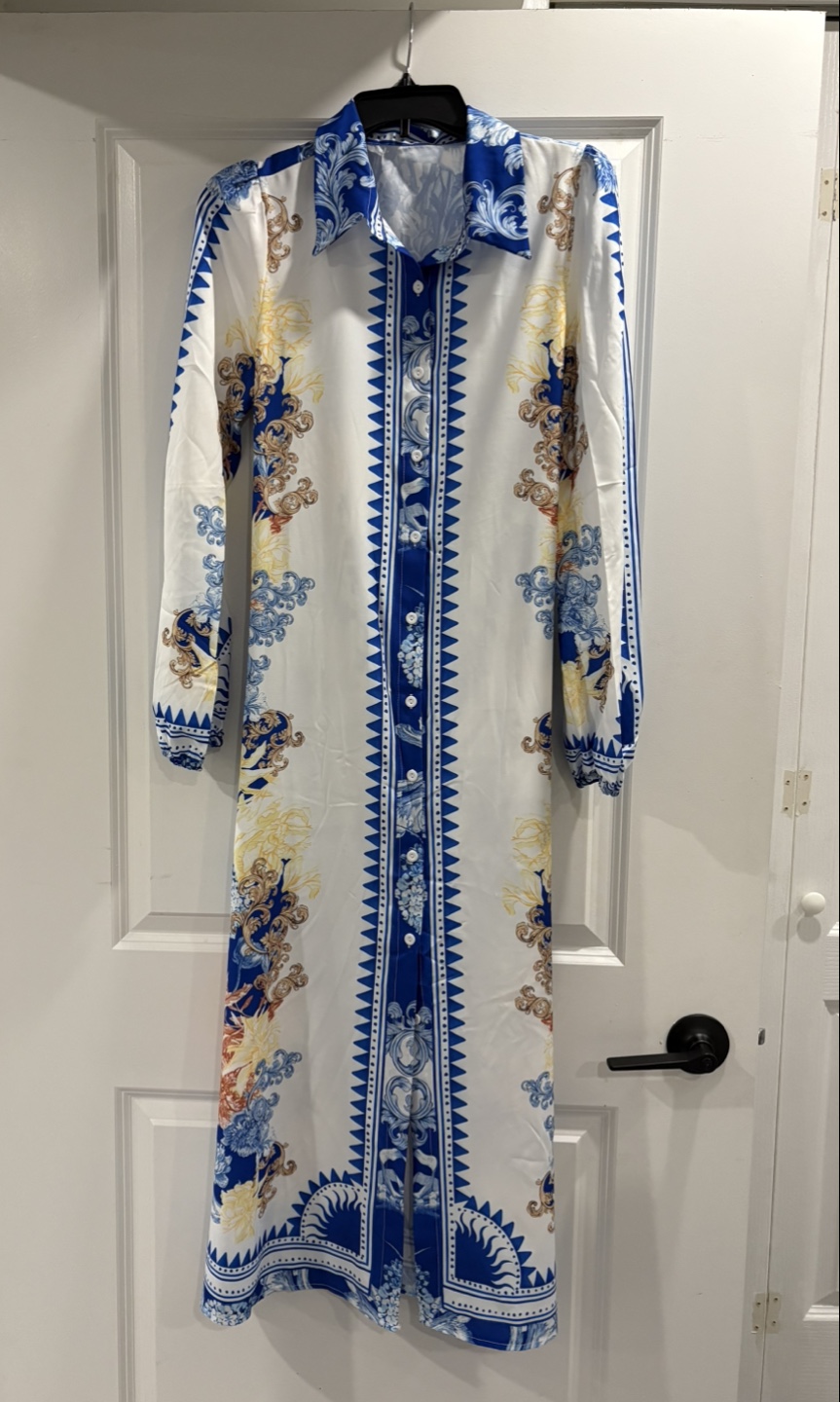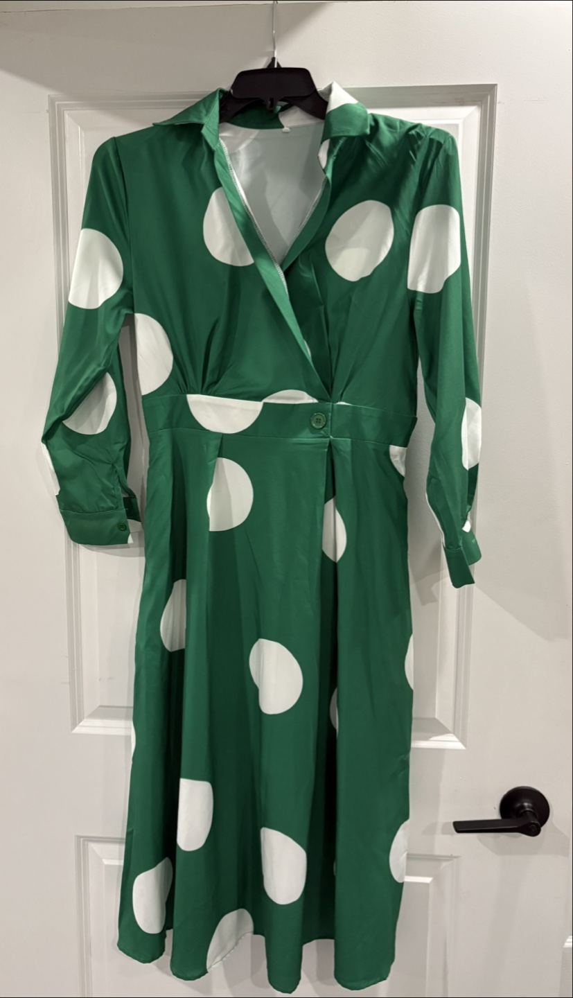 A bundle of dresses, all for you. First, a leopard print dress. Second, a green polka dot dress. Third, a white and blue patterned button down dress. Fourth,a lovely yellow dress. Consider wearing these dresses in a garden on a warm day. $45 each.