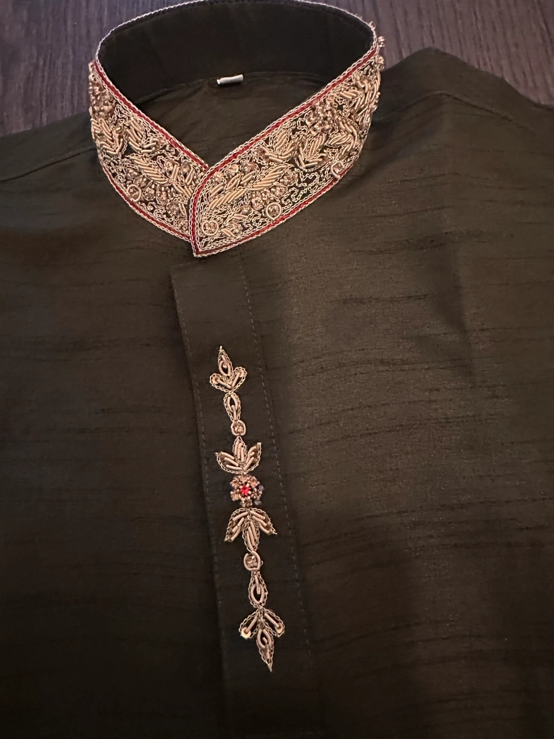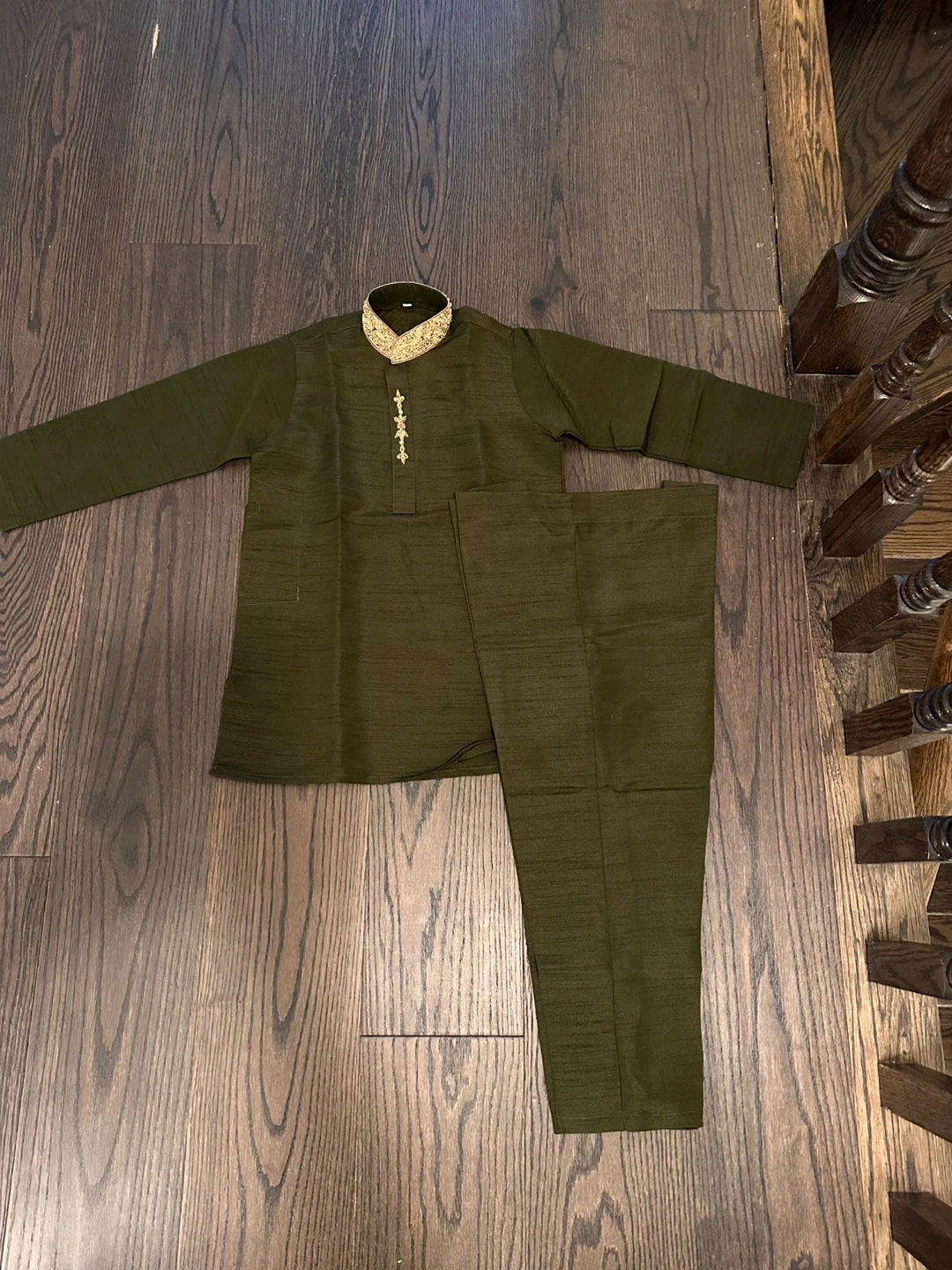 Boys desi kurta set in a dark green colour. It features intricate gold embroidery around the collar and down the placket. The set includes a kurta and matching pants. Brand new - $25.