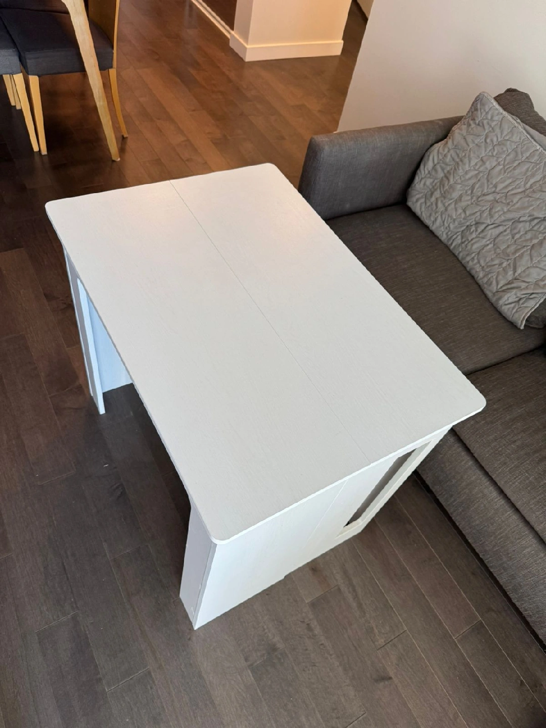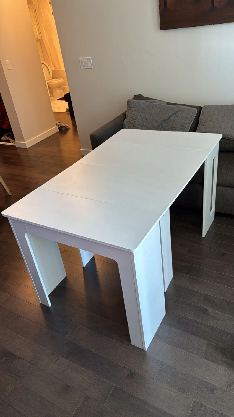 Selling a white extendable dining table in great condition! It's perfect for small spaces but can be expanded when you have guests over. The dimensions are 33.5 inches by 23.6 inches when closed, and it extends to 70.9 inches long. It's a versatile piece of furniture that will fit right into your home