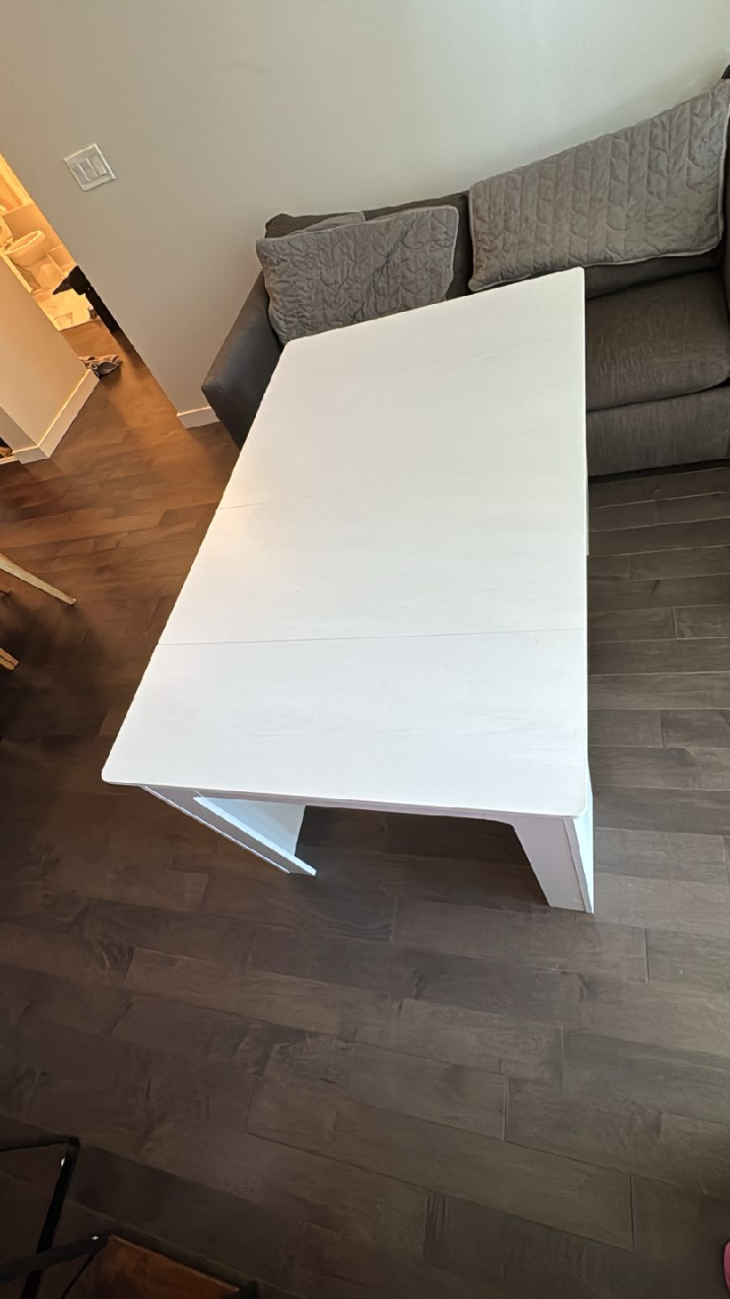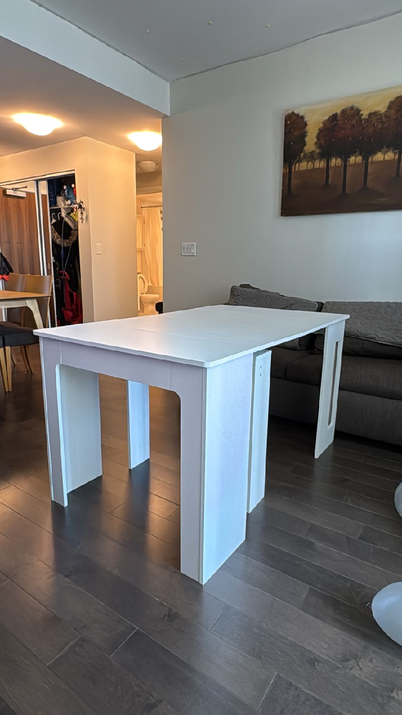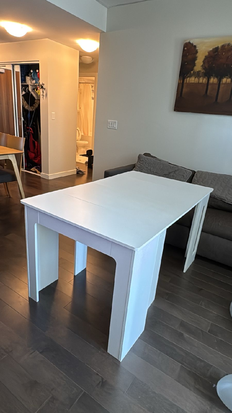 Selling a white extendable dining table in great condition! It's perfect for small spaces but can be expanded when you have guests over. The dimensions are 33.5 inches by 23.6 inches when closed, and it extends to 70.9 inches long. It's a versatile piece of furniture that will fit right into your home