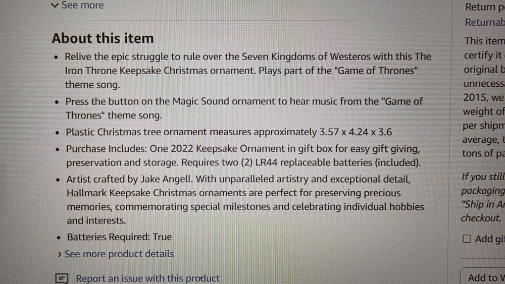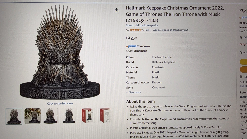 1 / 31 / 3Buy & SellGame of Thrones Keepsake BrandNewGame of Thrones Keepsake BrandNew$30Game of thrones Hallmark Keepsake Christmas Ornament 2022 with music brand new bought from Amazon.WHERE TO MEETFincham PlazaView MapSELLERKeshMarkham Village624 reviews0 chats·1 favorites·19 viewsSEND CHAT TO SELLERHi Kesh! I’m interested in your listing.Hi Kesh! I’m interested in your listing.Get the Karrot app to chatSign In to chat