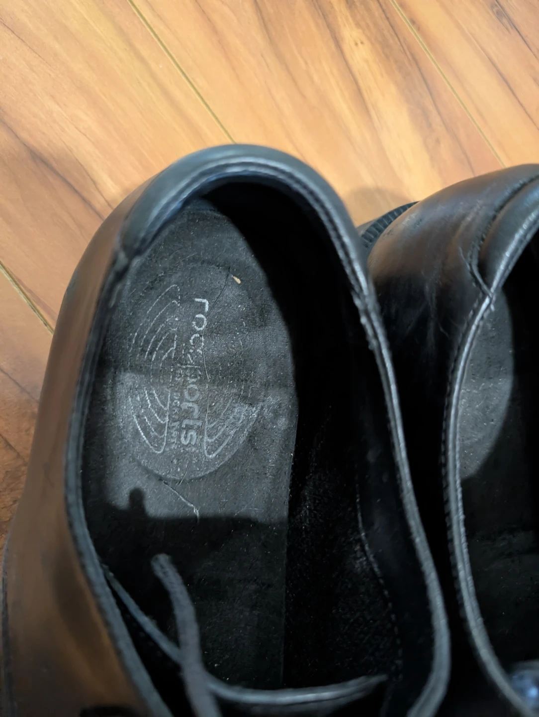 Men's black leather dress shoes by Rockport. These shoes are a size 10 US, 44 EUR. They feature a leather upper and a durable sole.