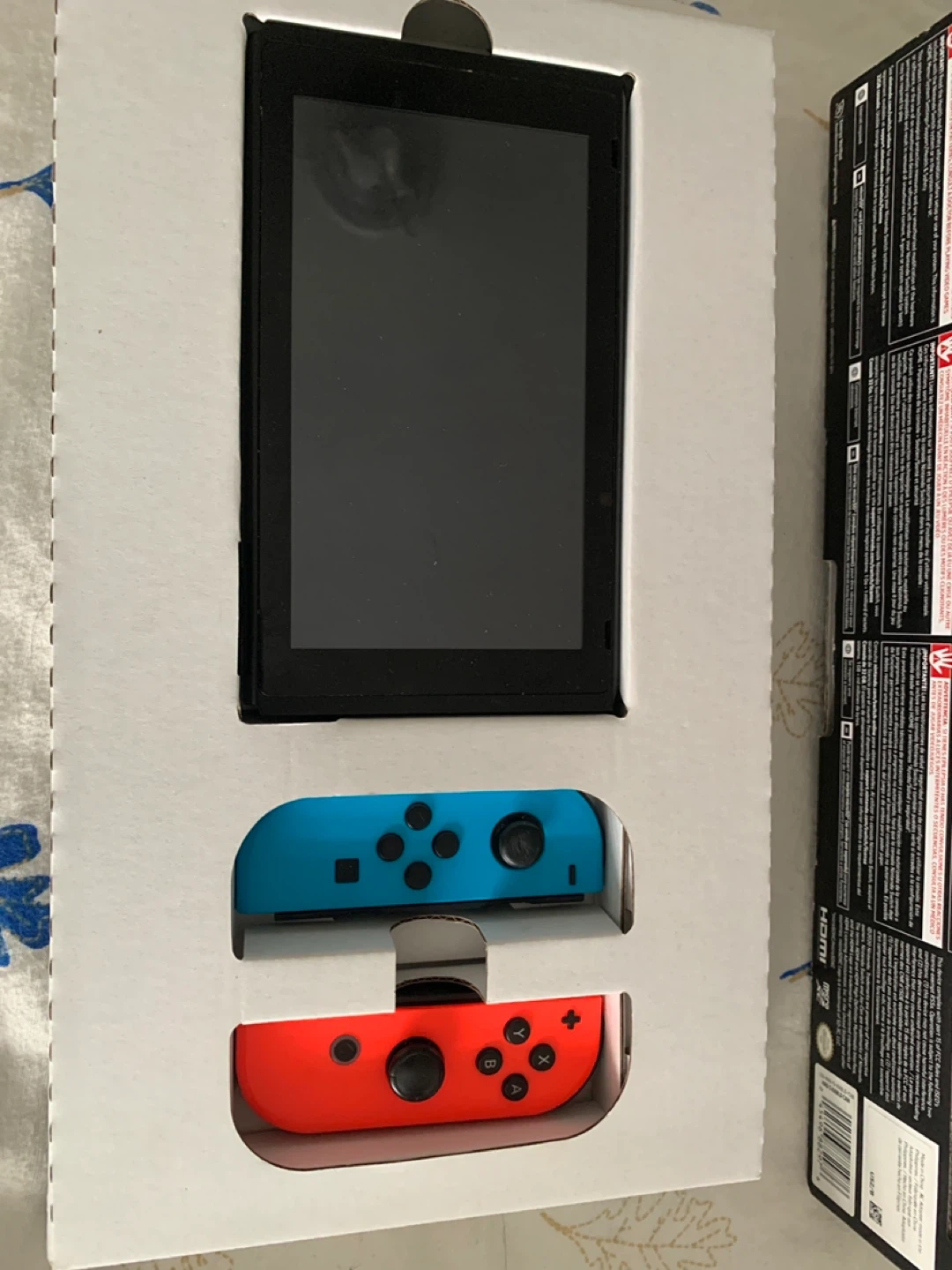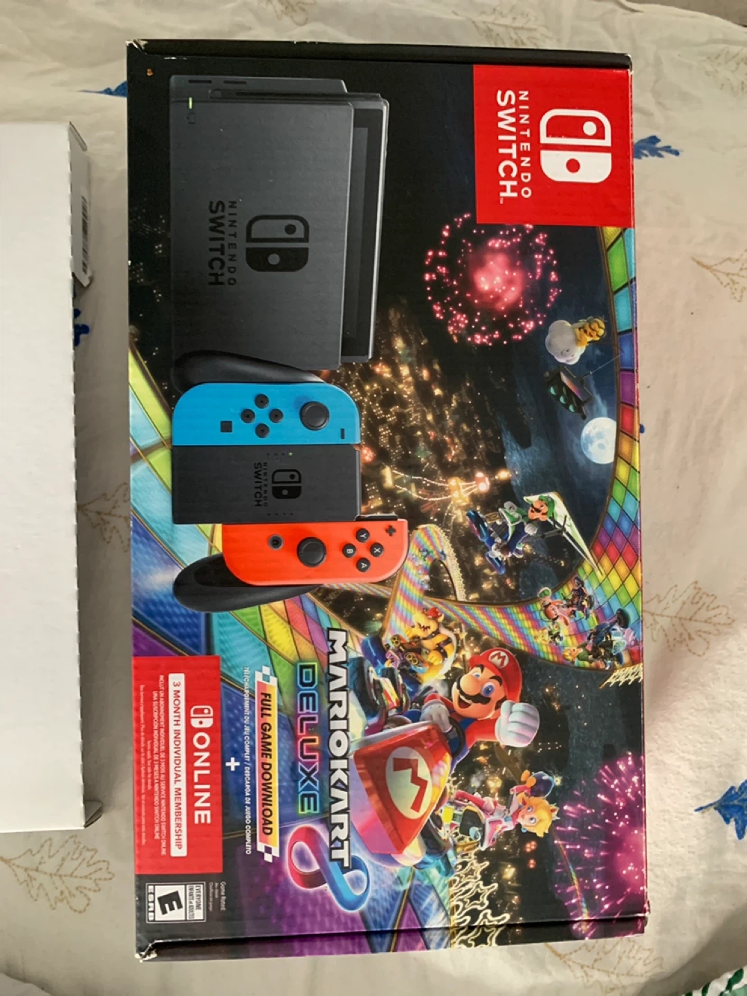 This is a Nintendo Switch console bundle that includes the Mario Kart 8 Deluxe game. It comes with the console, Joy-Con controllers in blue and red, dock, AC adapter, and all necessary cables. Enjoy gaming on the go or at home! Comes with pro gaming controller as well as an all white Nintendo switch case!