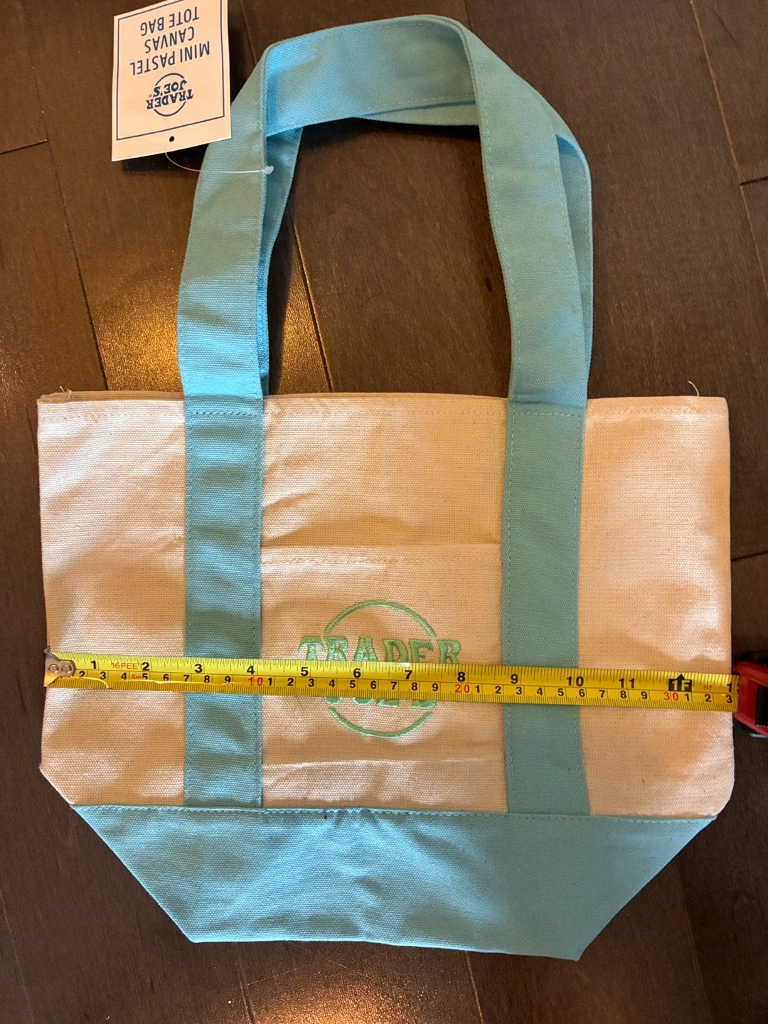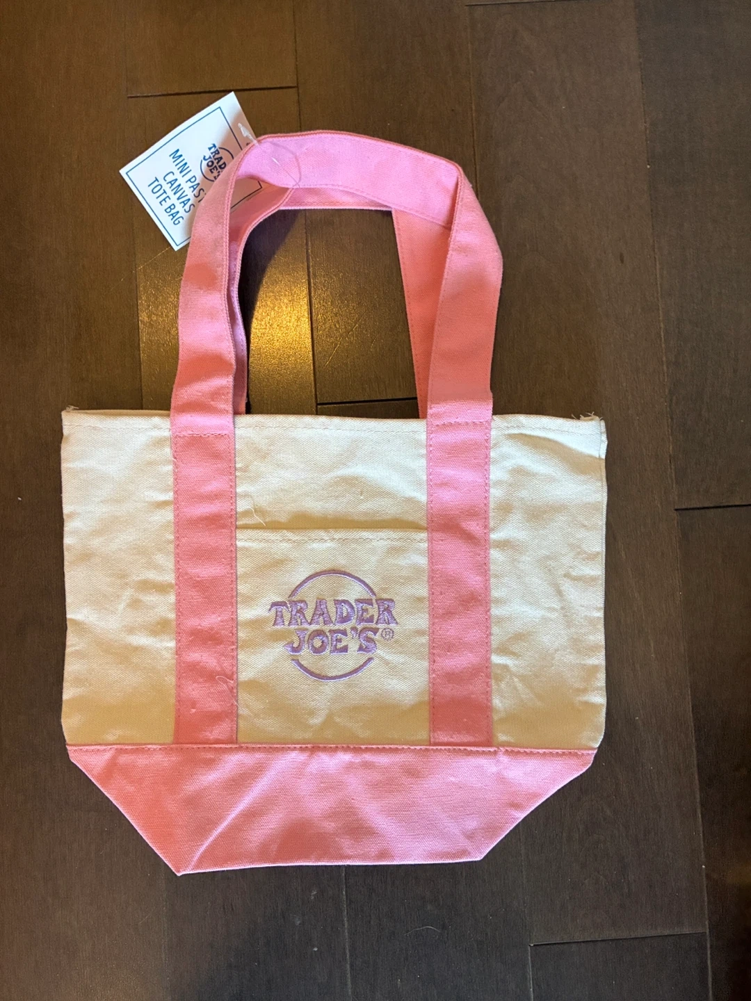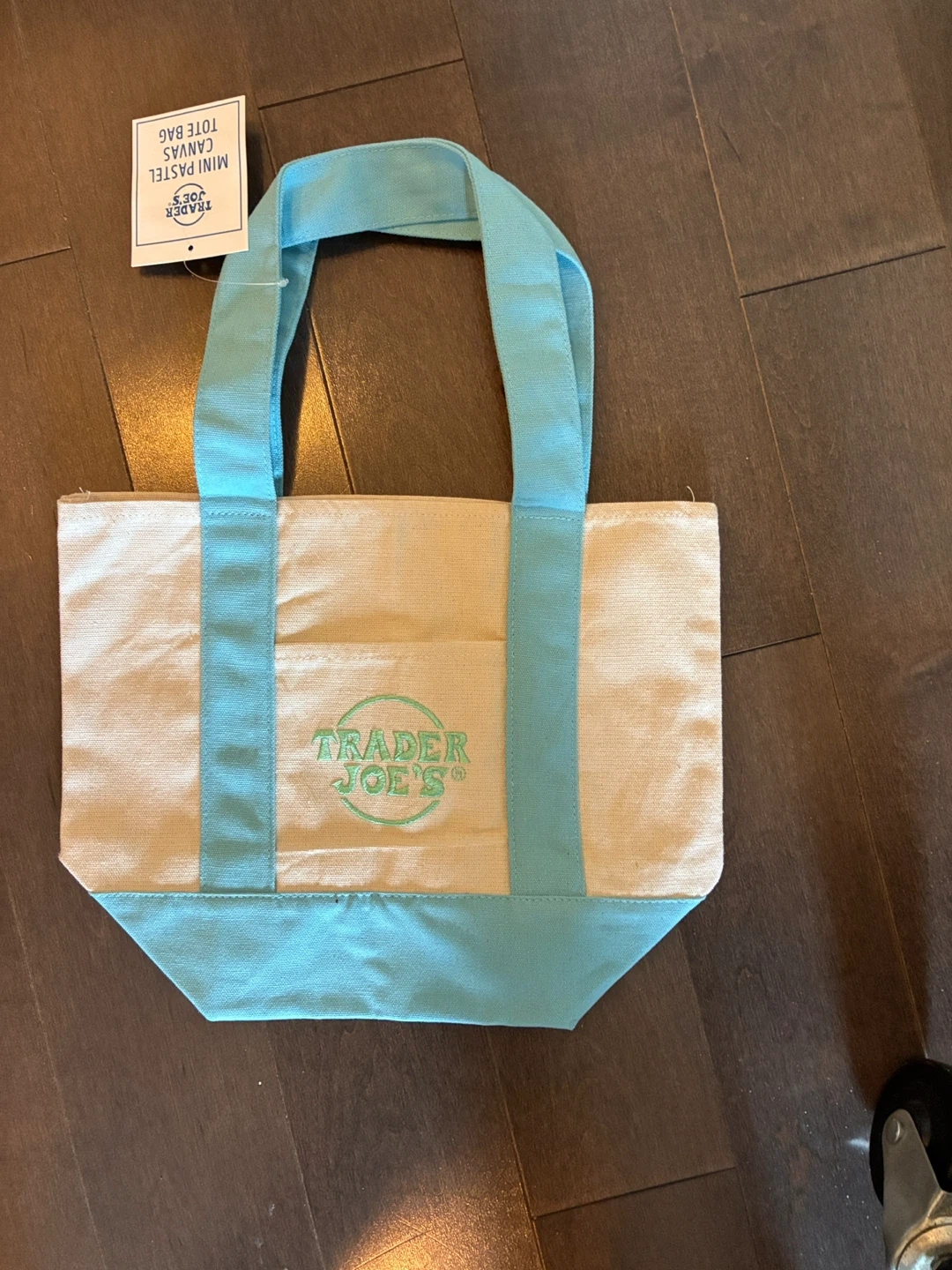 Trader Joe's mini canvas tote bag in a pastel lavender colour. It's made of 100% Cotton and measures approximately 10 inches wide. This little bag is super handy for small errands or as a lunch bag! Selling for $20 each.
