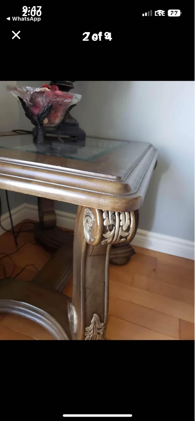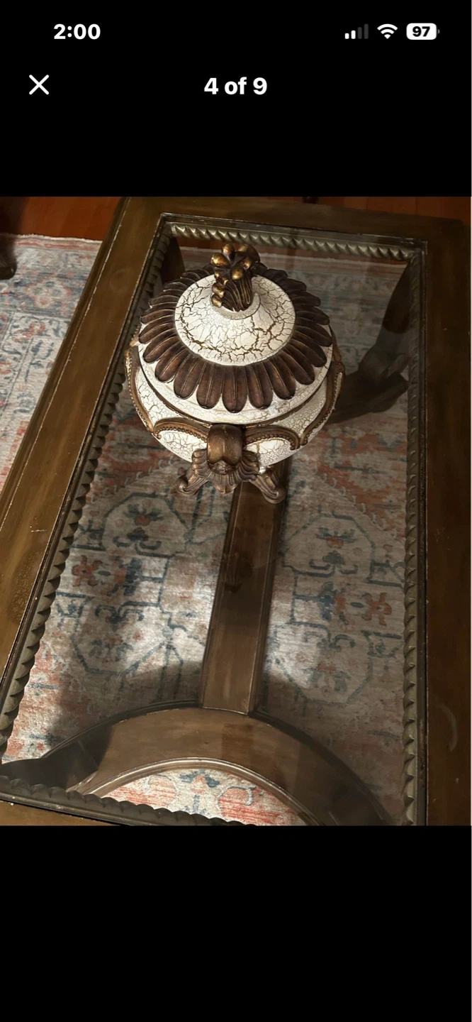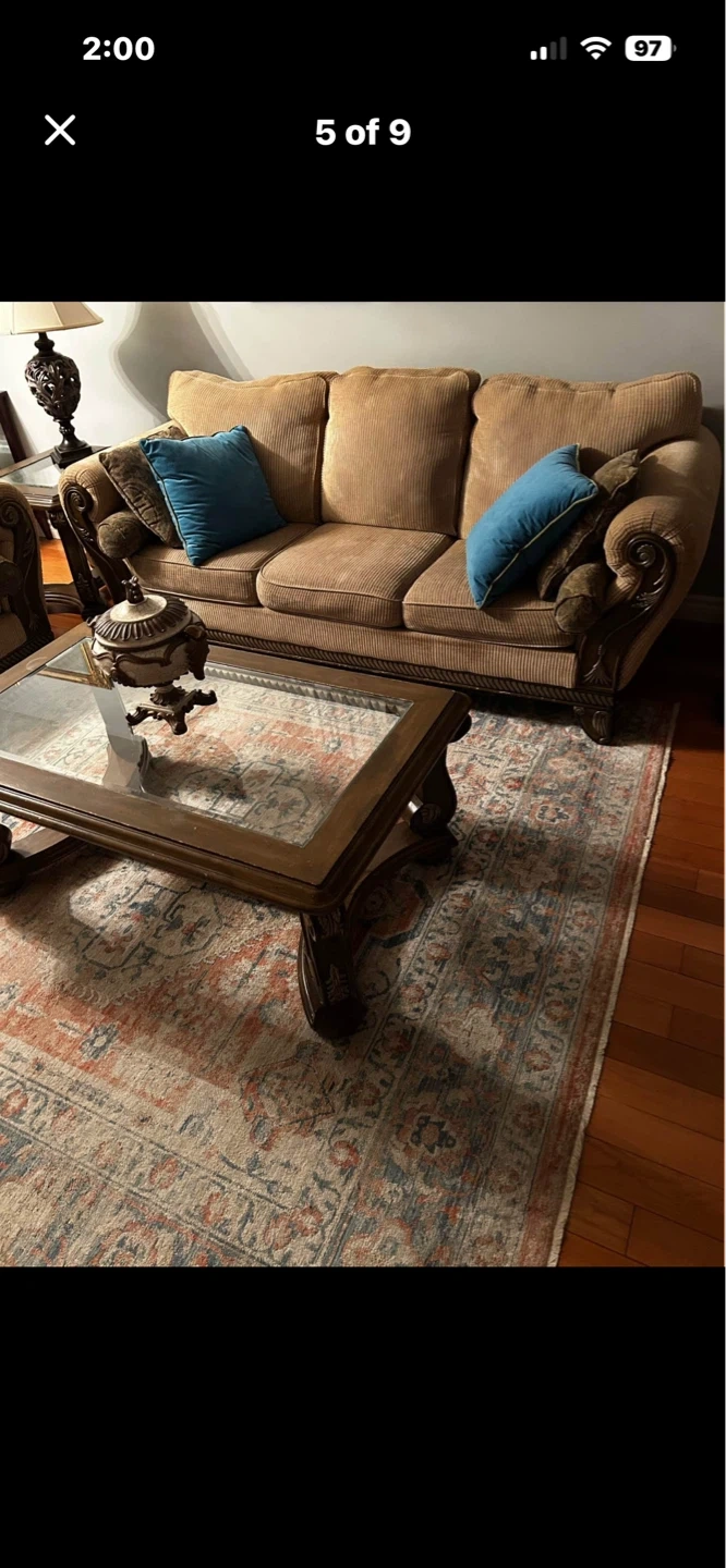 Very comfortable and beautifully crafted wooden coffee table featuring an ornate design and a clear glass top with detailed carvings adds a touch of elegance to any living space. Includes the sofa, the loveseat, a coffee table and 2 night tables. Classic, expensive antique furniture.