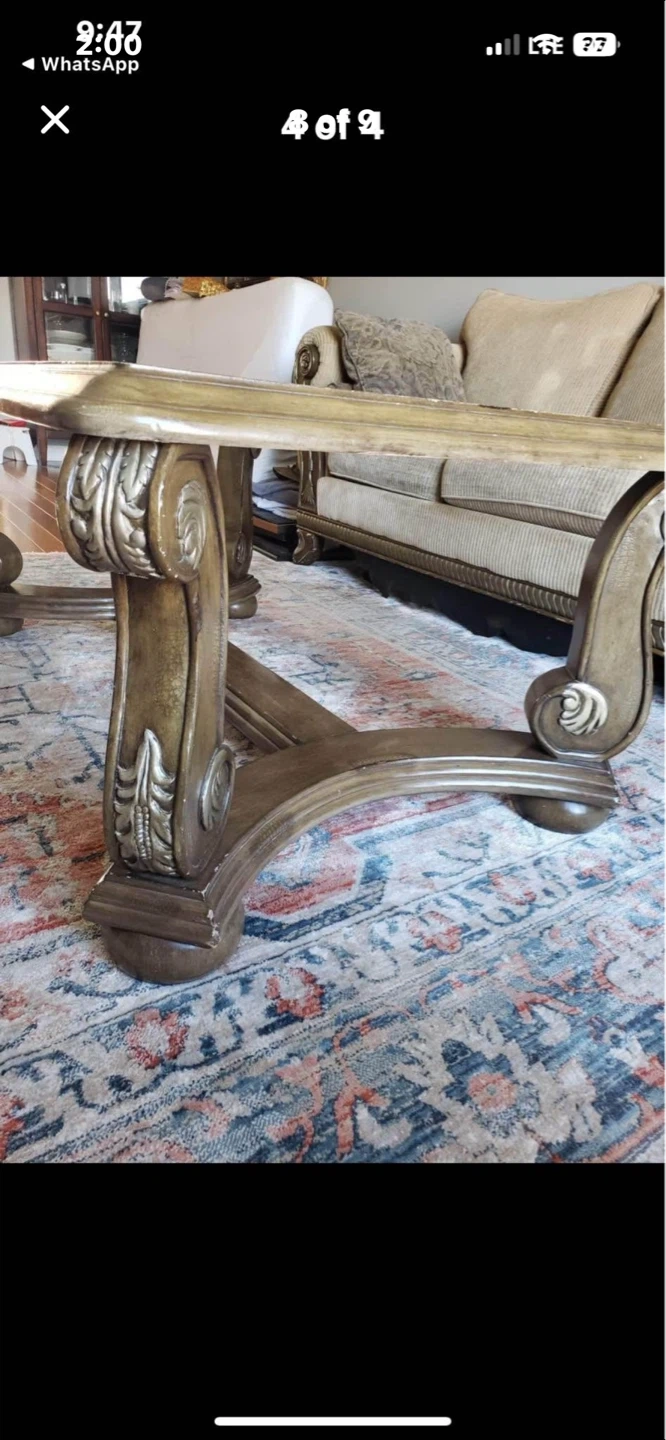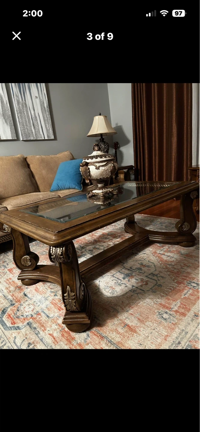 Very comfortable and beautifully crafted wooden coffee table featuring an ornate design and a clear glass top with detailed carvings adds a touch of elegance to any living space. Includes the sofa, the loveseat, a coffee table and 2 night tables. Classic, expensive antique furniture.