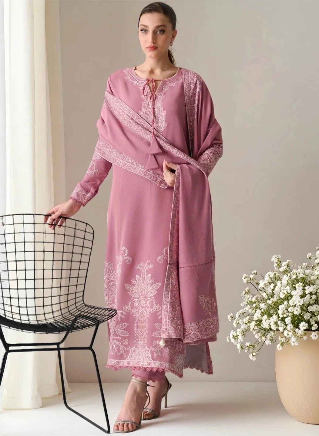 This exquisite Daily/Basic Wear 3 Piece Kurta Set is perfect for all seasons. The long PINK Dhanak kurta features intricate embroidered work, paired with a straight trouser in the same fabric. The set includes a matching Dhanak dupatta for a complete look. Elevate your wardrobe with this tasteful ensemble from Saifron.