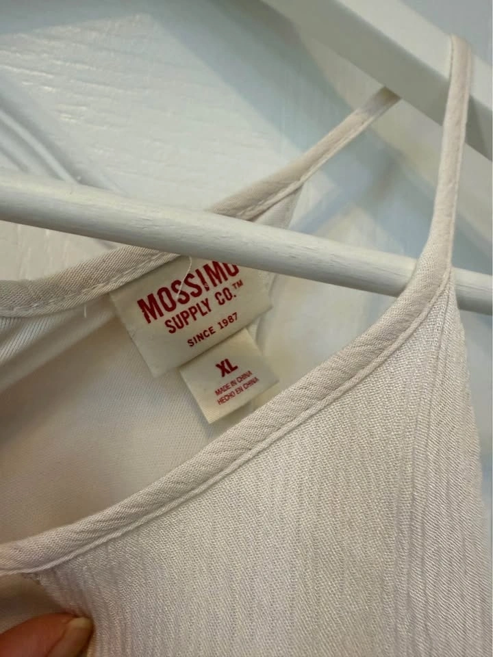 Cream/off-white, Size XL. This dress sits above the knee if you have a longer torso. Wore this for one event. It does not have much stretch and is double lined, making it very comfortable and not see-through. Runs true to size but would fit nicely as an oversized dress if you normally wear a large. The details on this dress make it easy to dress up or dress down, depending on whether you want to wear sneakers with it or dress shoes!