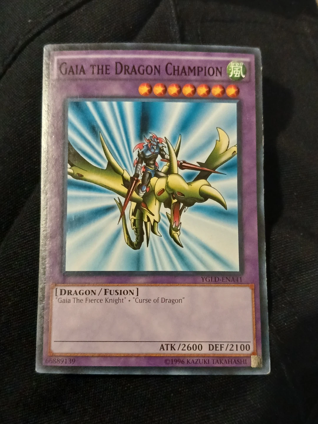 This is a Yu-Gi-Oh! Gaia the Dragon Champion trading card. It's a Fusion Monster with ATK 2600 and DEF 2100. ©1996 Kazuki Takahashi. Cash only. Pick up or meet up in public place.