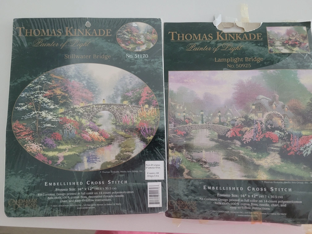 I have two Thomas Kinkade Painter of Light embellished cross stitch kits for sale!