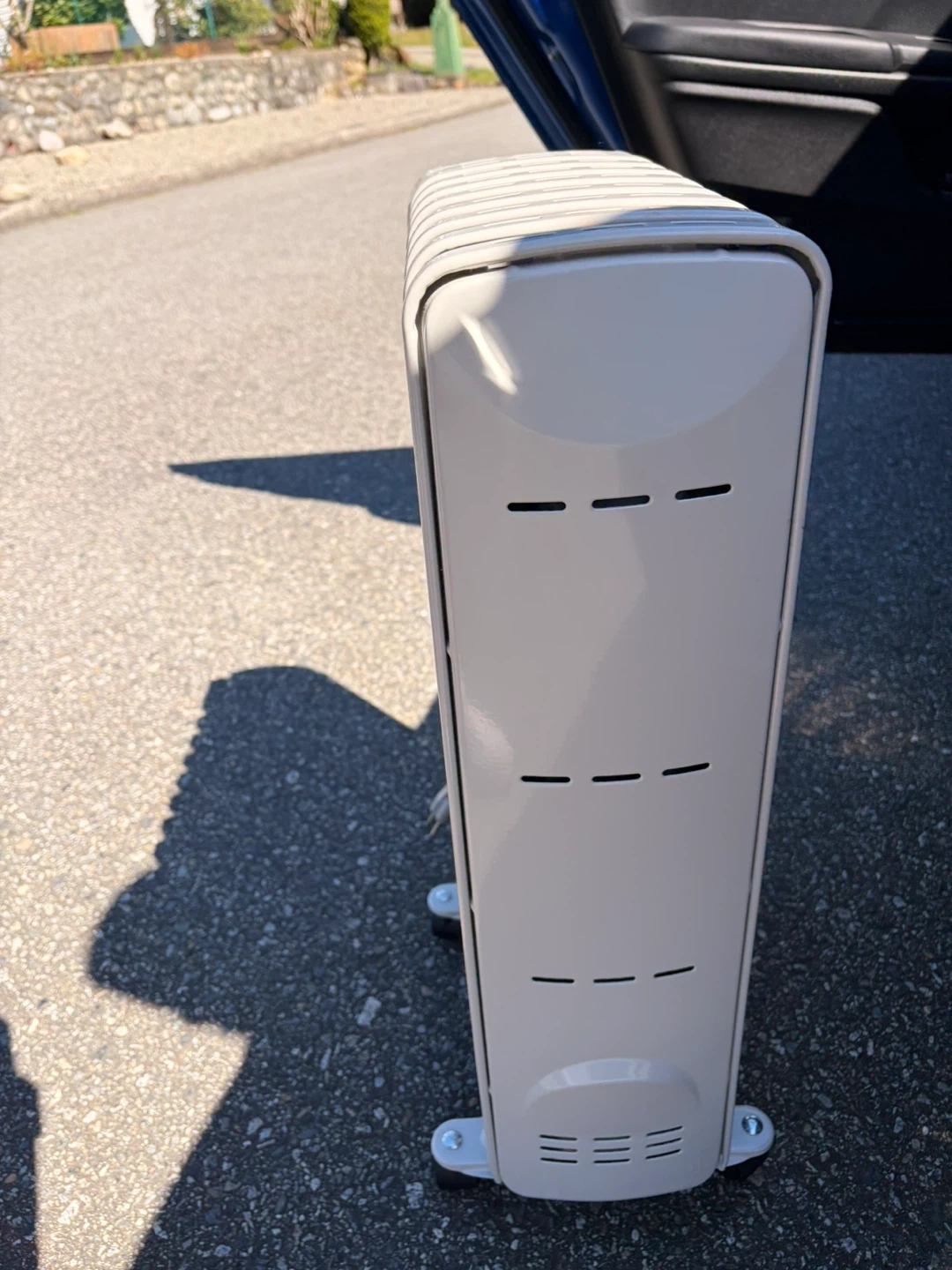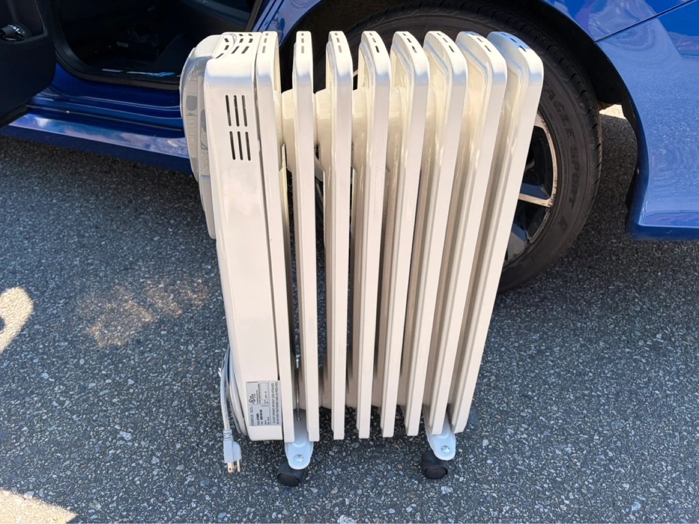 White Kenwood oil-filled radiator heater. It has wheels for easy transport. This heater is great for keeping a room cozy during colder months!