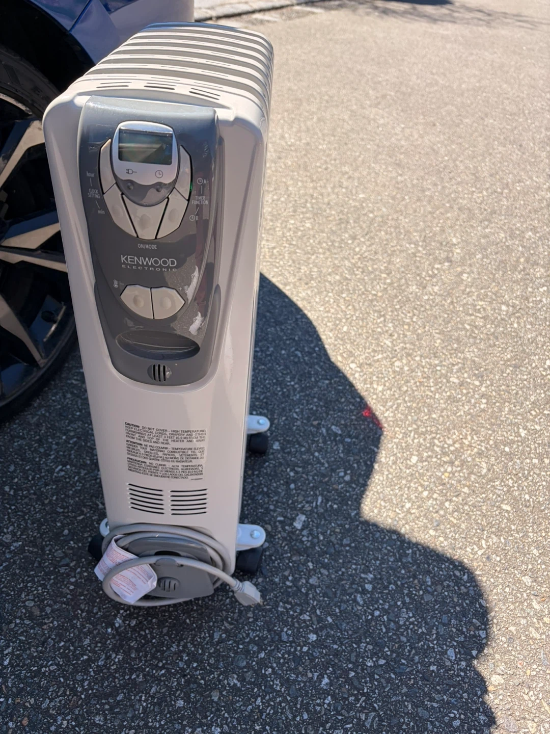 White Kenwood oil-filled radiator heater. It has wheels for easy transport. This heater is great for keeping a room cozy during colder months!
