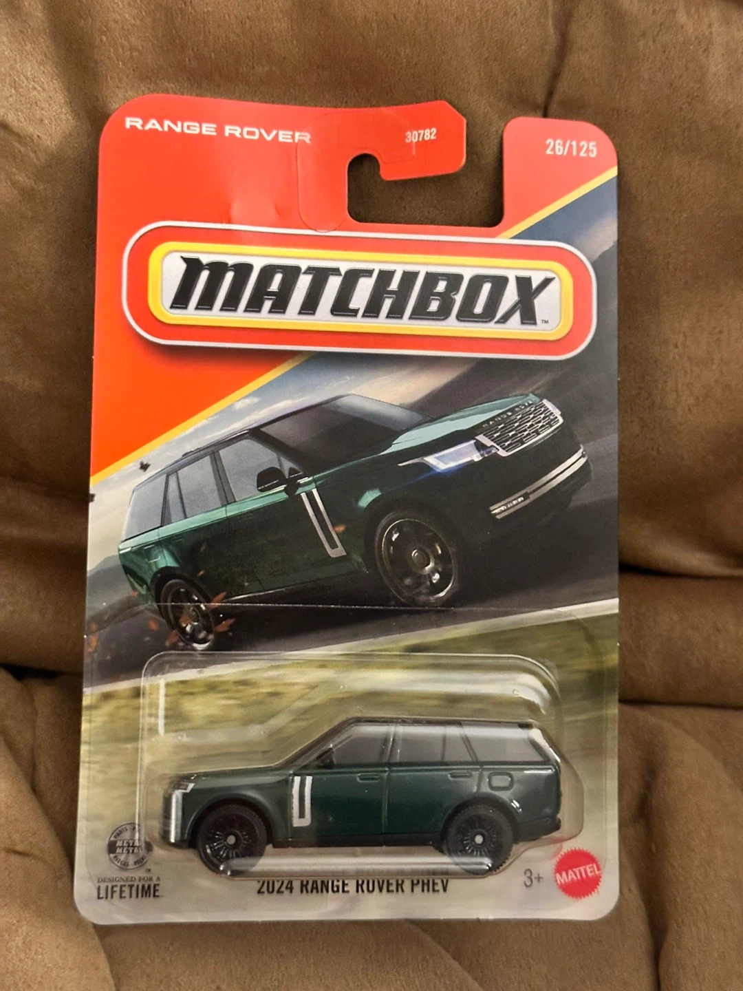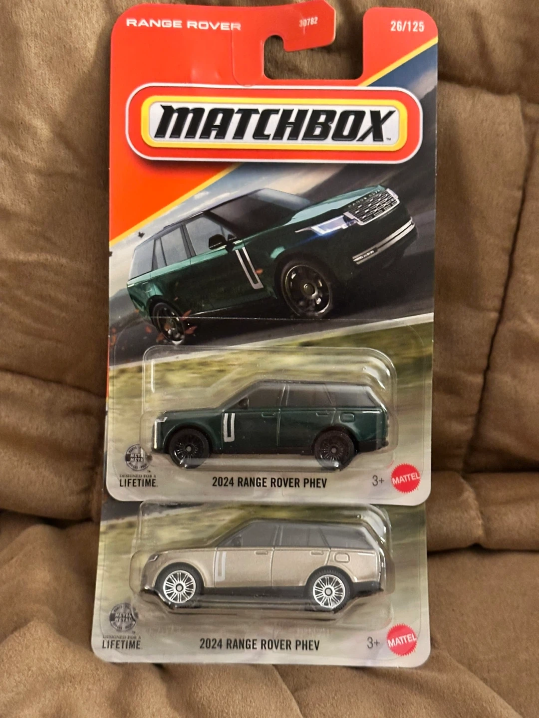 Selling a pair of Matchbox 2024 Range Rover PHEV die-cast cars. Includes one green and one tan vehicle. Perfect for collectors or play!