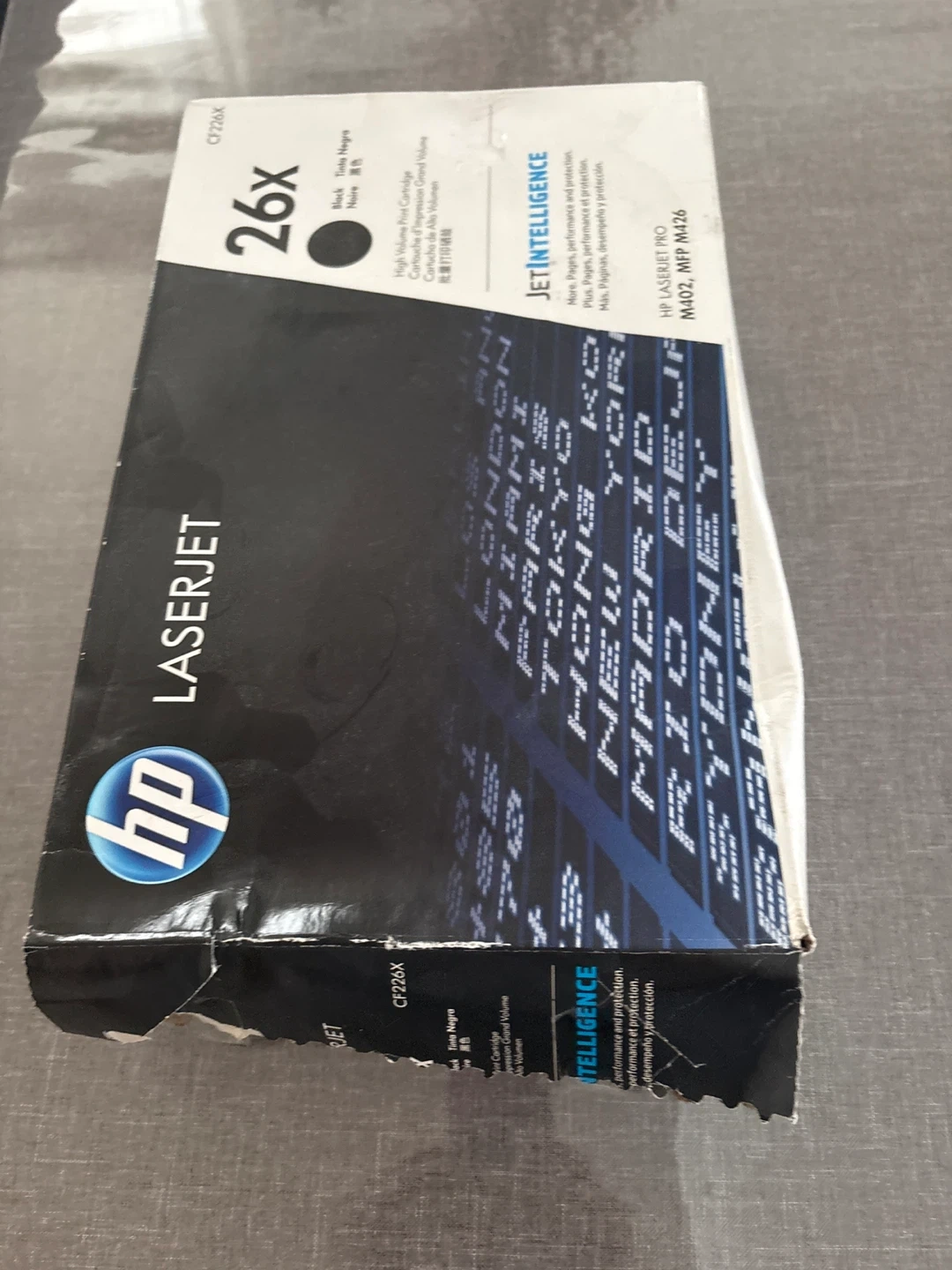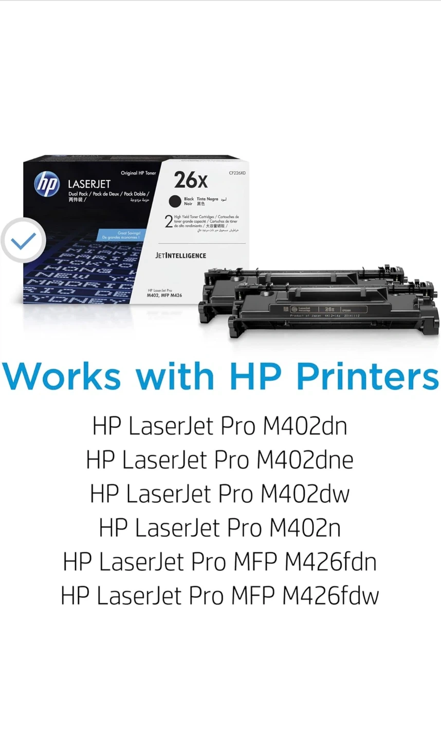 This is a dual pack of HP 26X High Yield Black Original Toner Cartridges. It's designed for HP LaserJet Pro M402, MFP M426 series printers. Includes toner cartridges.open box