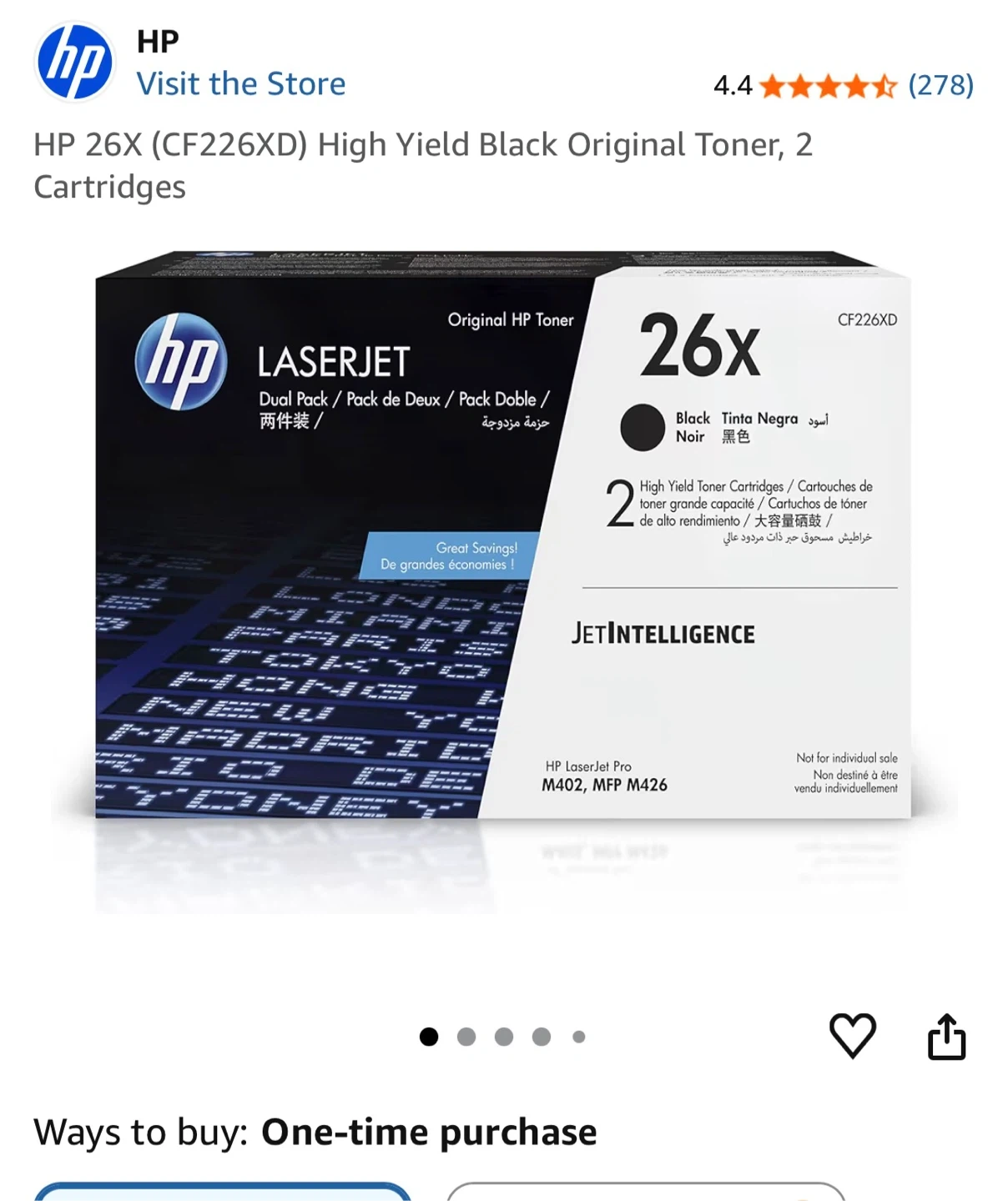 This is a dual pack of HP 26X High Yield Black Original Toner Cartridges. It's designed for HP LaserJet Pro M402, MFP M426 series printers. Includes toner cartridges.open box