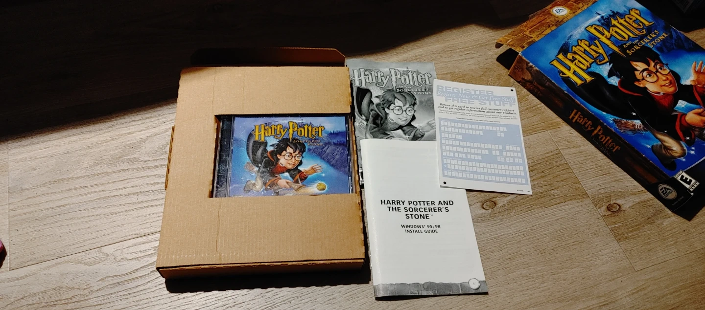 This PC game is Harry Potter and the Sorcerer's Stone. It comes with the original box, game CD, and install guide. Features include solving puzzles and flying on a broomstick.