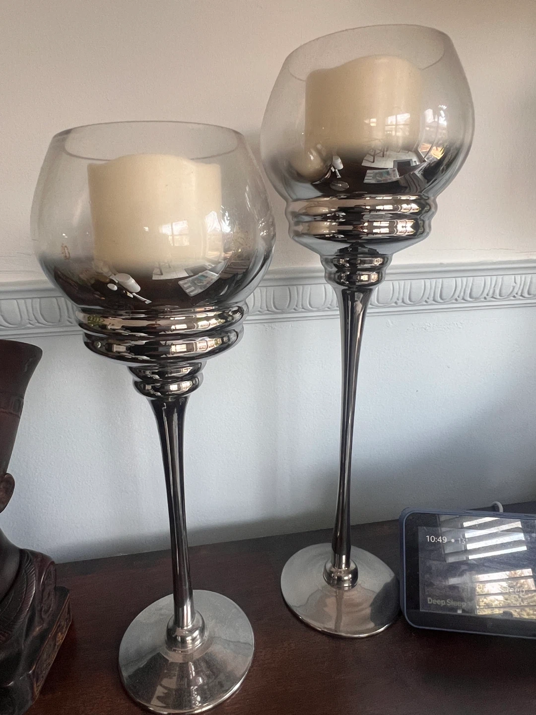 This is a set of two decorative candle holders. They're made of clear glass globes with silver metal bases and stems. The glass has a slight gradient. They hold pillar candles.
