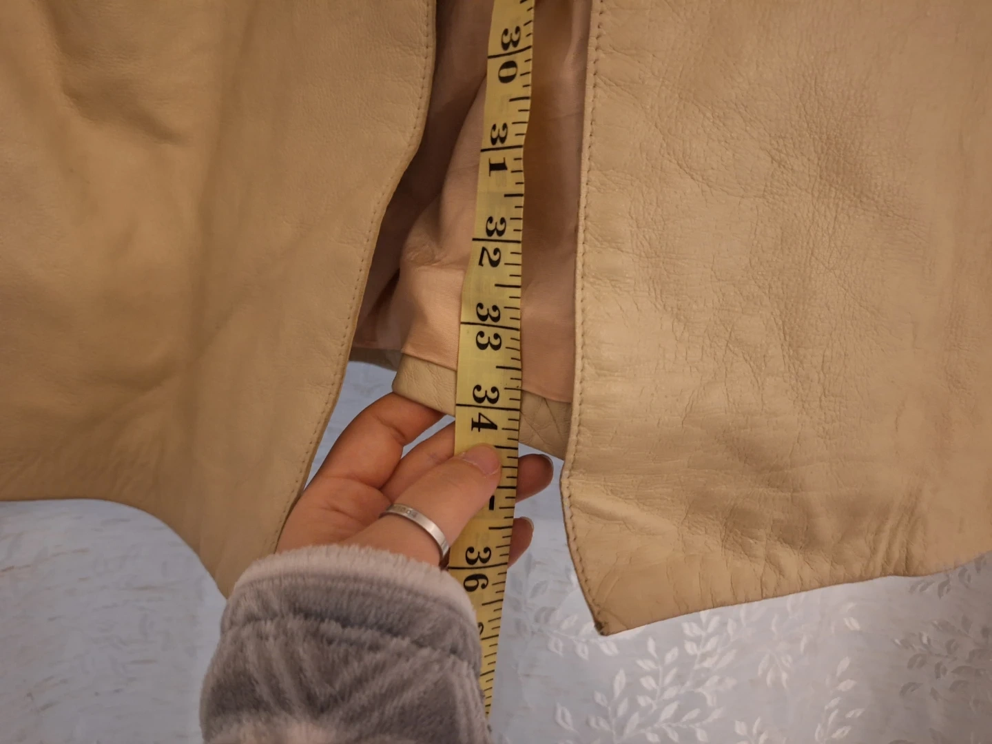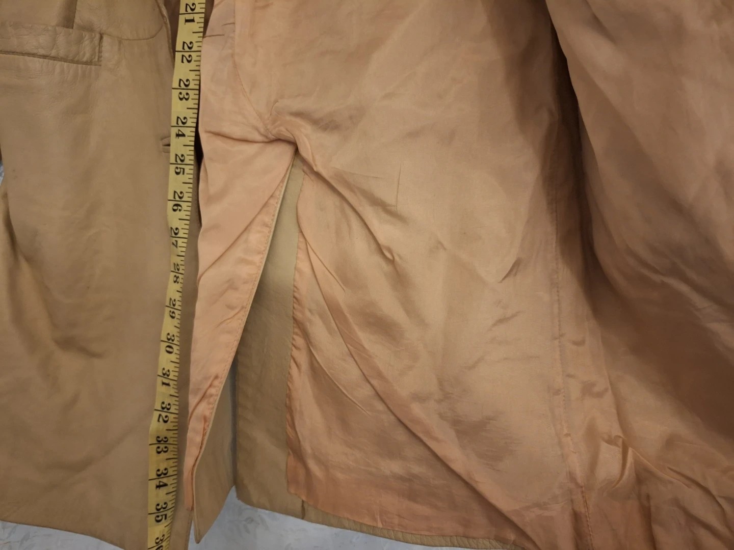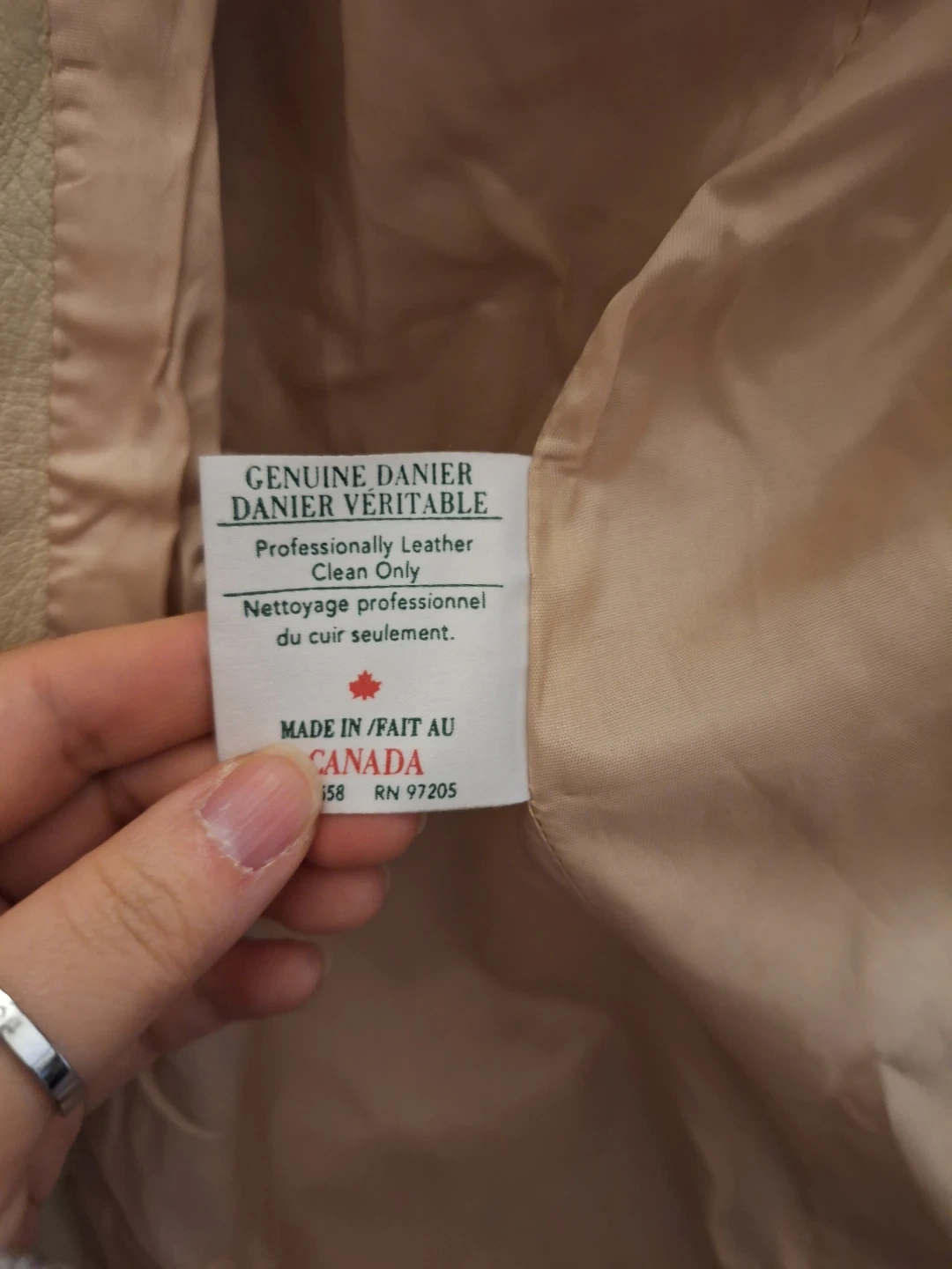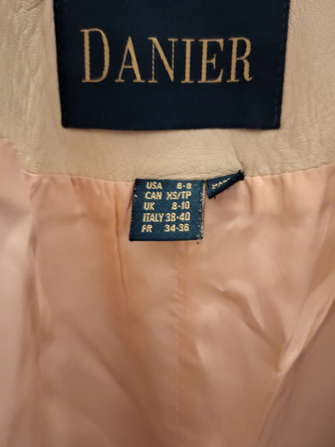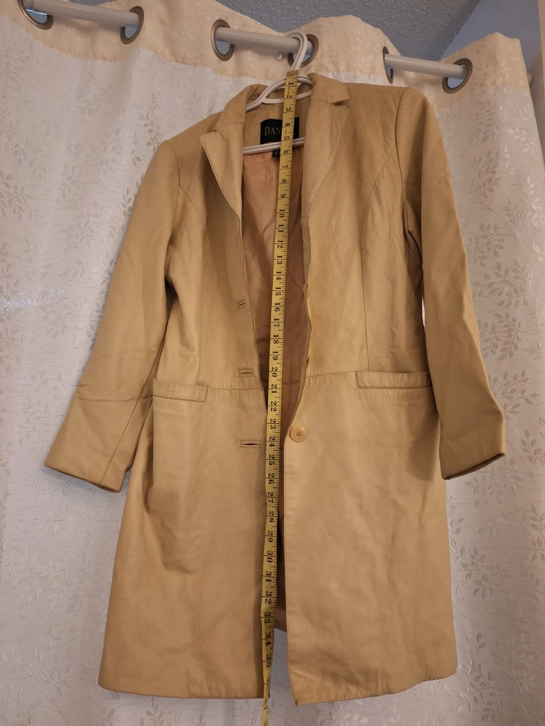 Pick up only! Danier leather coat in a beautiful neutral colour! It is a size XS/TP (Extra Small/Très Petit). The coat measures approximately 33 inches in length. Made in Canada!