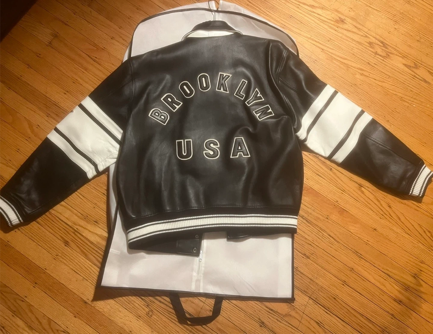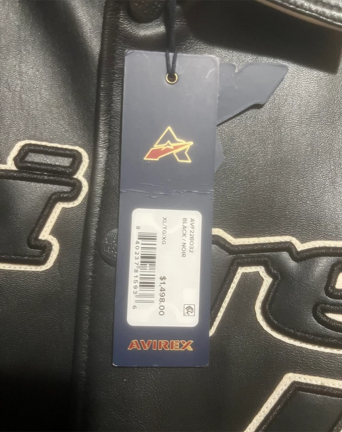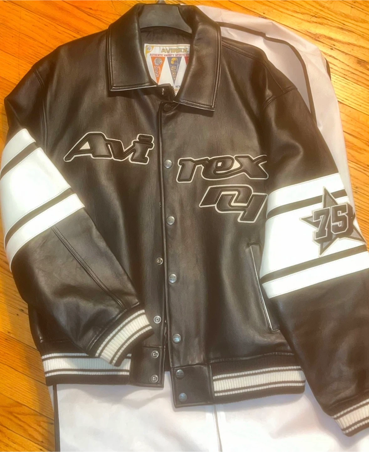leather jacket in size XL. Worn for 30 mins for a photo shoot basically brand new tags still on it don’t come with one bag It's a stylish black/noir color. The jacket features a cool design with "Avirex" lettering on the front and "Brooklyn USA" on the back