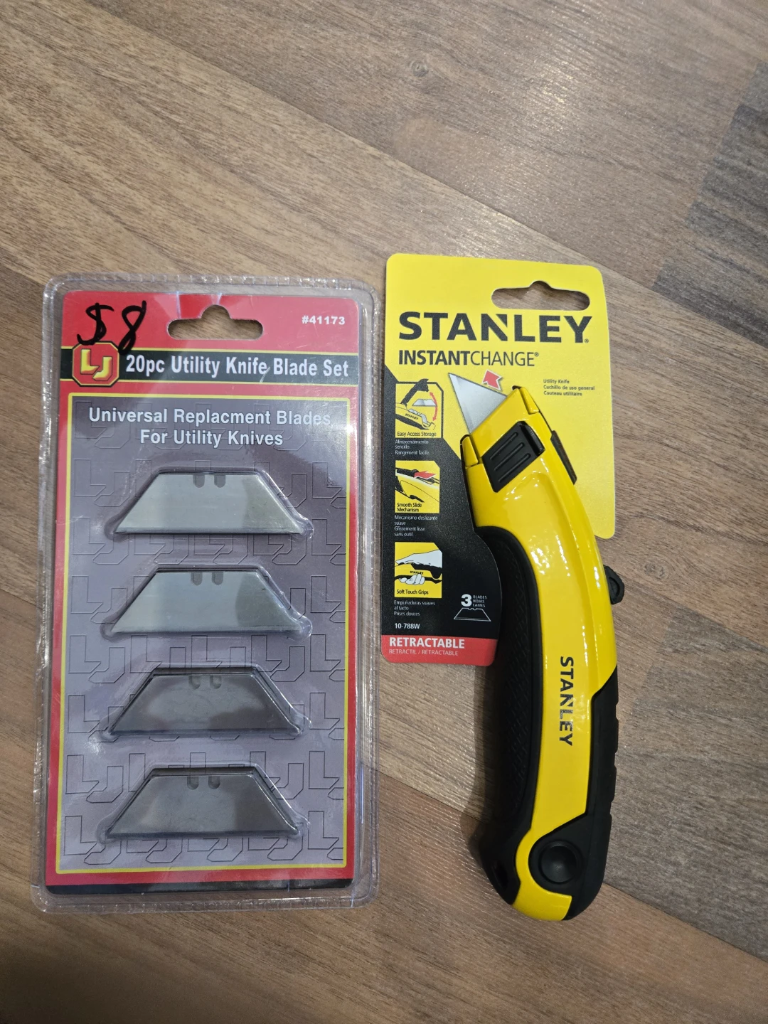 Get this handy Stanley InstantChange utility knife along with a 20-piece universal replacement blade set. The knife features easy access storage, a smooth slide mechanism, and soft touch grips. Blades are universal and suitable for most utility knives. It's great for various cutting tasks around the house or job site!