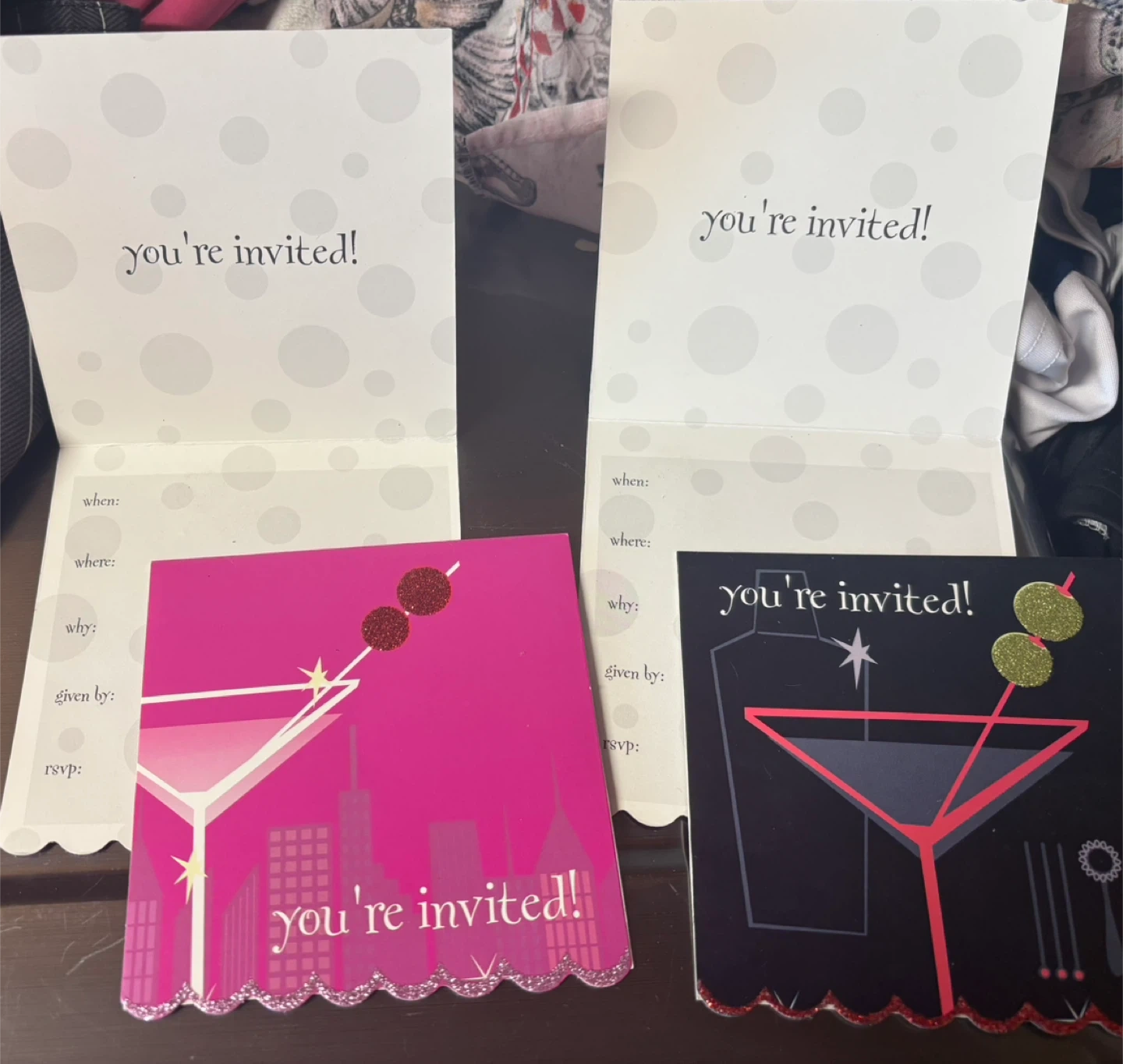 Set of four cocktail-themed party invitations. Two feature a hot pink city skyline design with glittery cherries, and two have a black and red martini glass design. Each card is ready to be filled out with event details.