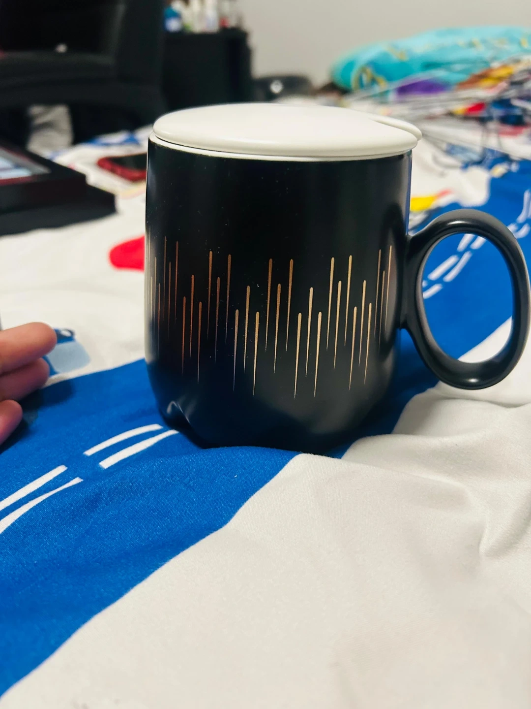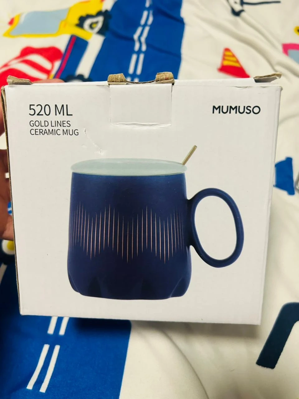This is a Mumuso ceramic mug with a gold lines design. It holds 520ml and comes with a matching lid and a spoon. It's made from ceramic material.