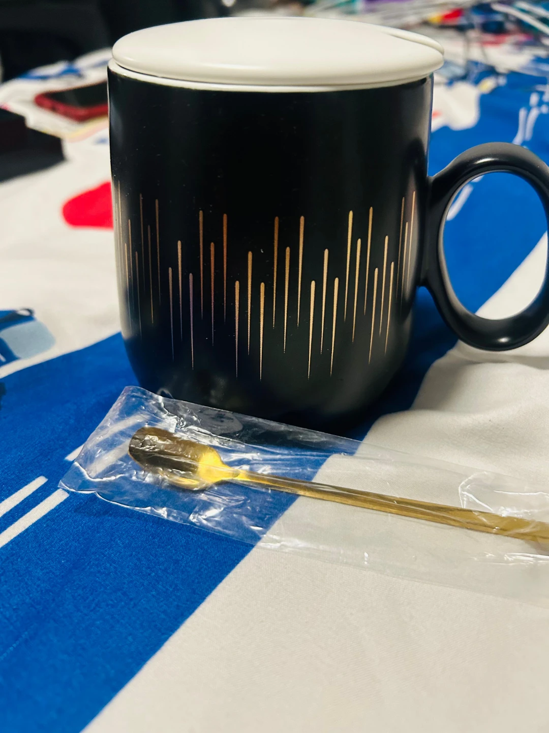 This is a Mumuso ceramic mug with a gold lines design. It holds 520ml and comes with a matching lid and a spoon. It's made from ceramic material.
