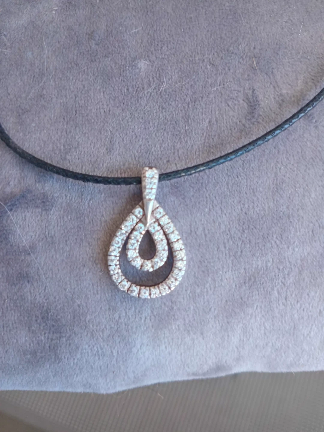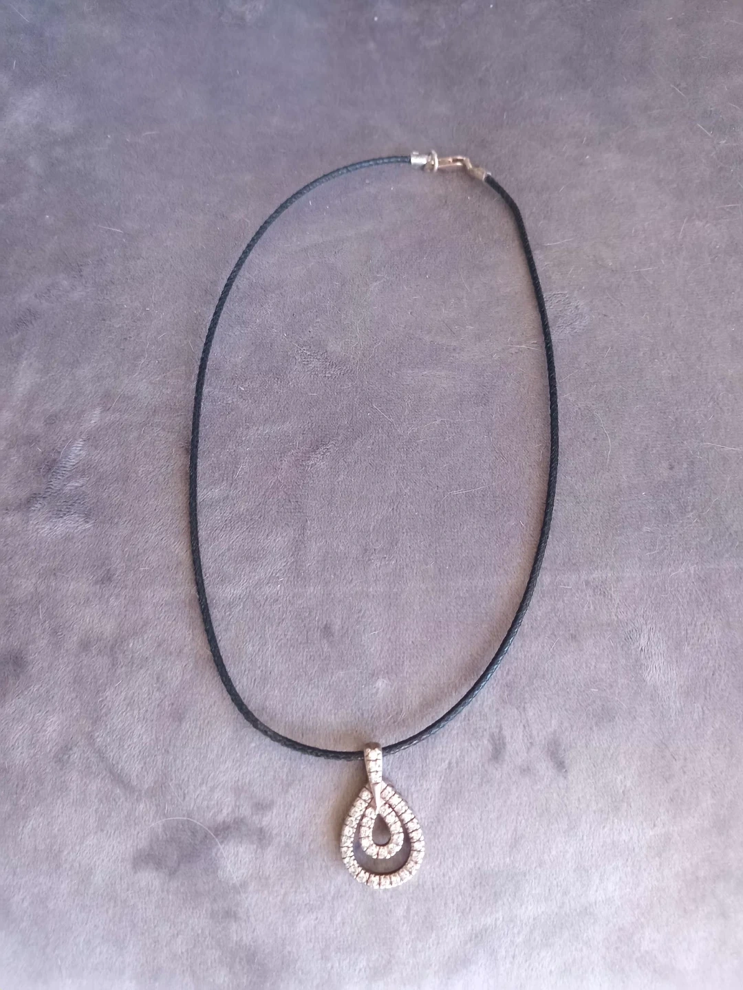 Silver pendant with a double-circle design, encrusted with cubic zirconia, on a leather strap with sterling silver clasp.