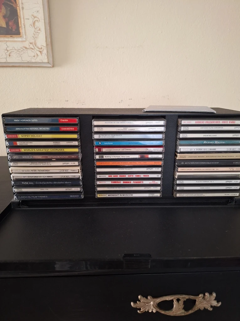 I'm selling a black CD storage cabinet. It has several shelves for organizing your CDs. Perfect for any music lover!