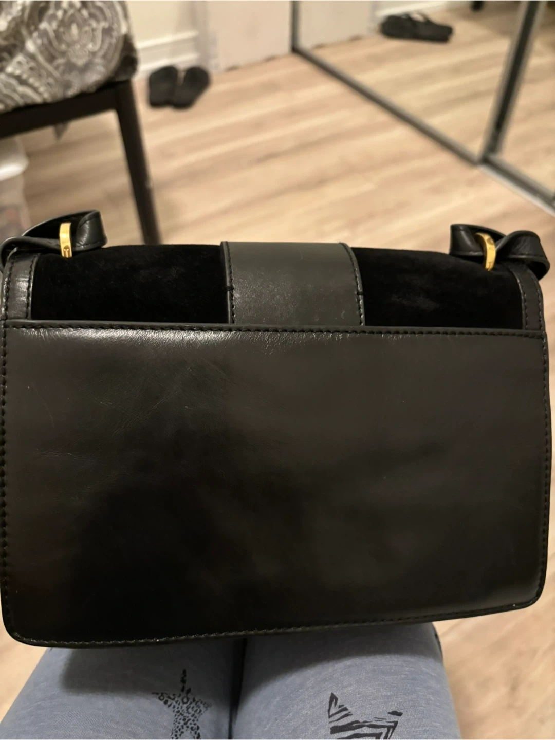 Stylish black shoulder bag from Ted Baker London. It's made with a combination of soft suede and smooth leather. Gold-tone hardware accents the front clasp and strap details.