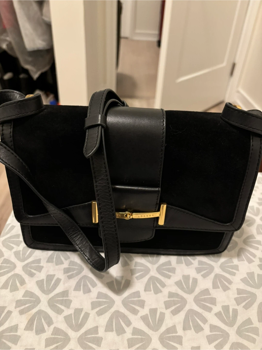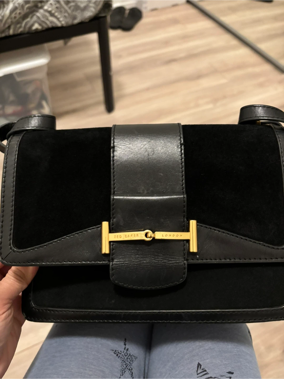 Stylish black shoulder bag from Ted Baker London. It's made with a combination of soft suede and smooth leather. Gold-tone hardware accents the front clasp and strap details.