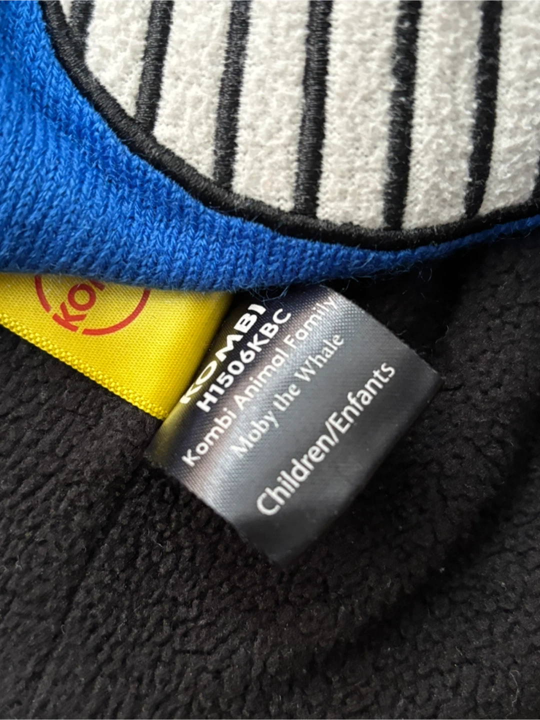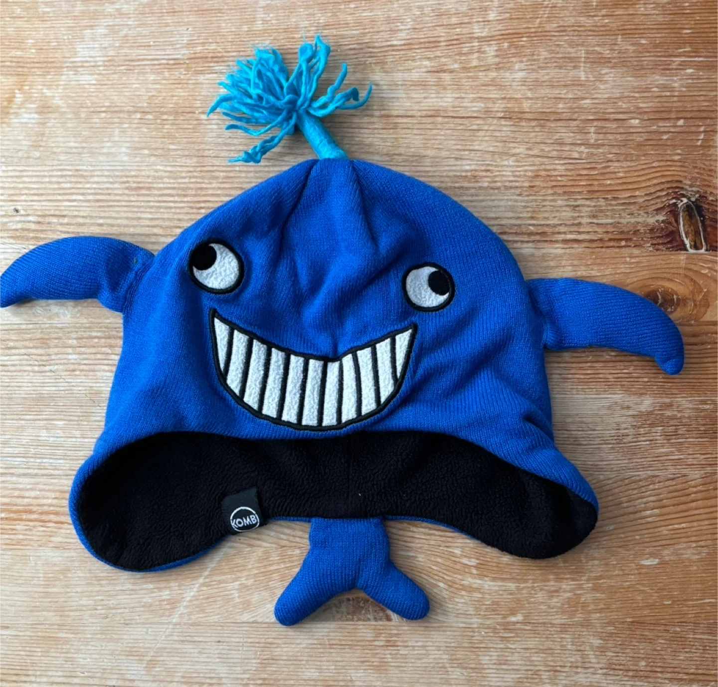 This blue Kombi knit hat is designed like a whale with a fun face and a tassel on top. It's lined with black fleece for extra warmth. Size 1, perfect for little ones heading out in the cold! Gently used it was very love it.