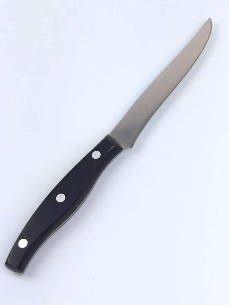 This is a Zwilling Twin Signature utility knife. It's made in Germany with a stainless steel blade and a black synthetic handle. It's a handy knife for various kitchen tasks.