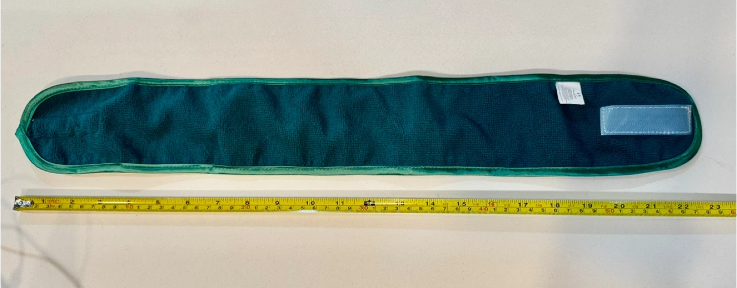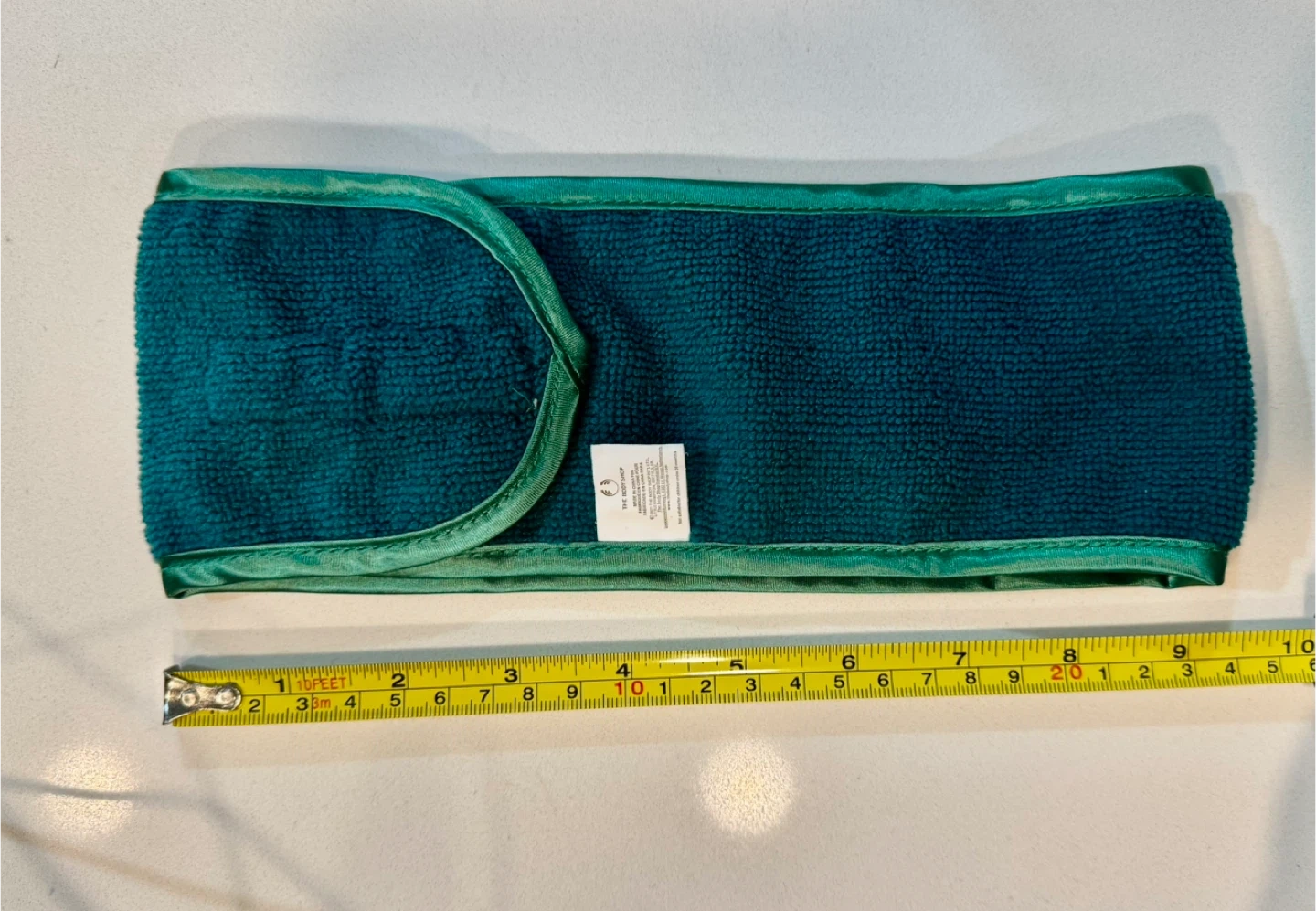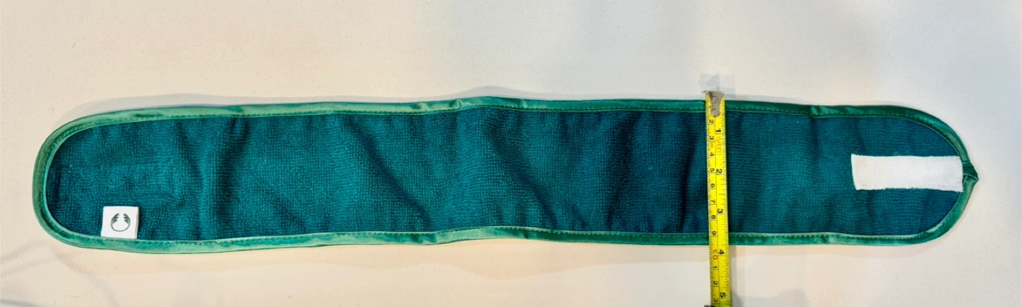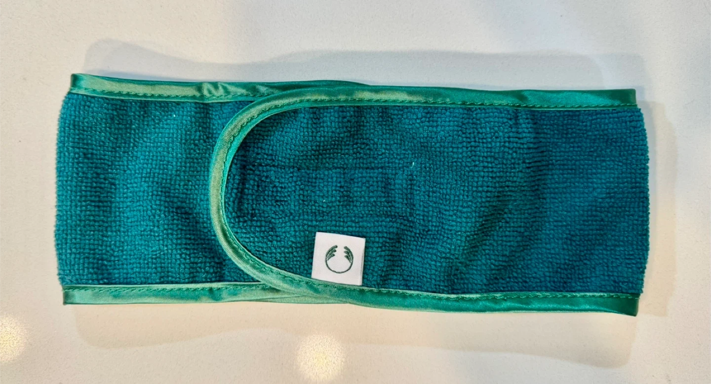 This teal terry cloth headband is perfect for keeping hair back during skincare routines. It features a Velcro closure for an adjustable fit. Made from soft, absorbent material.