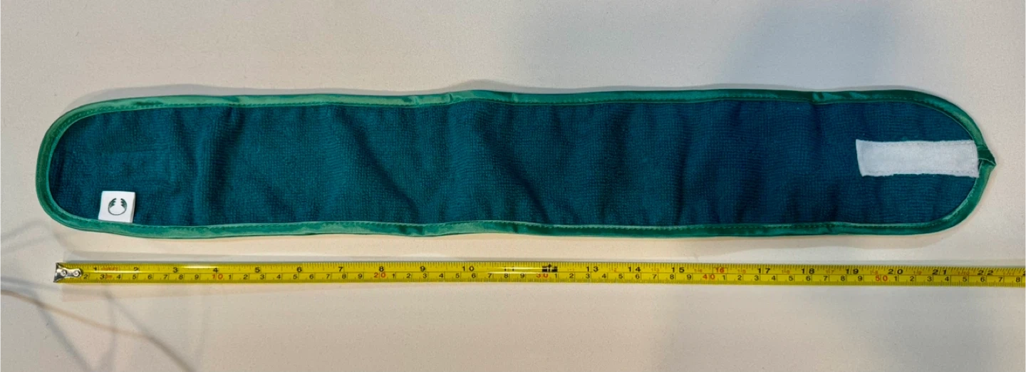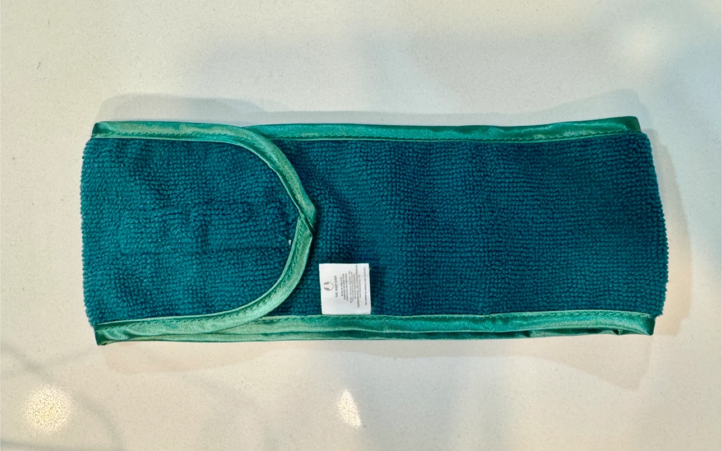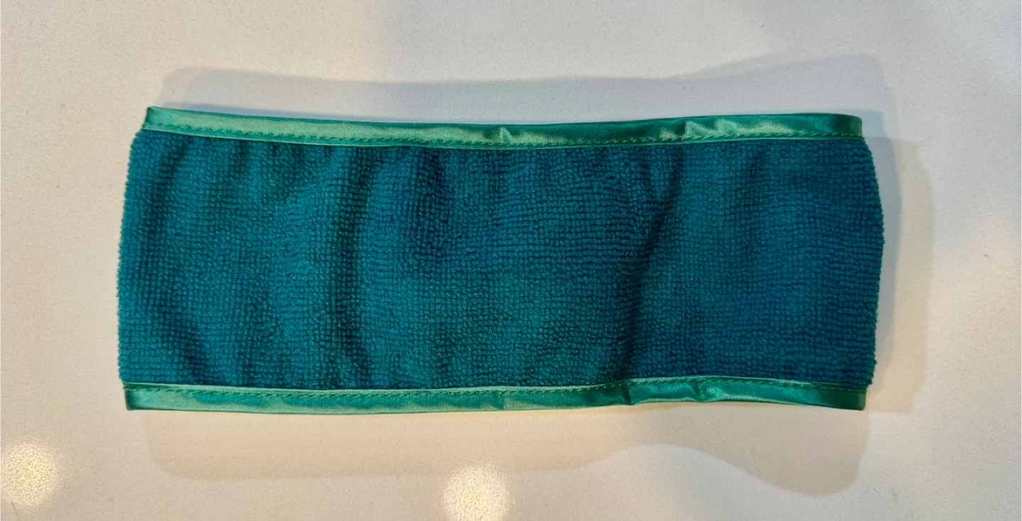 This teal terry cloth headband is perfect for keeping hair back during skincare routines. It features a Velcro closure for an adjustable fit. Made from soft, absorbent material.