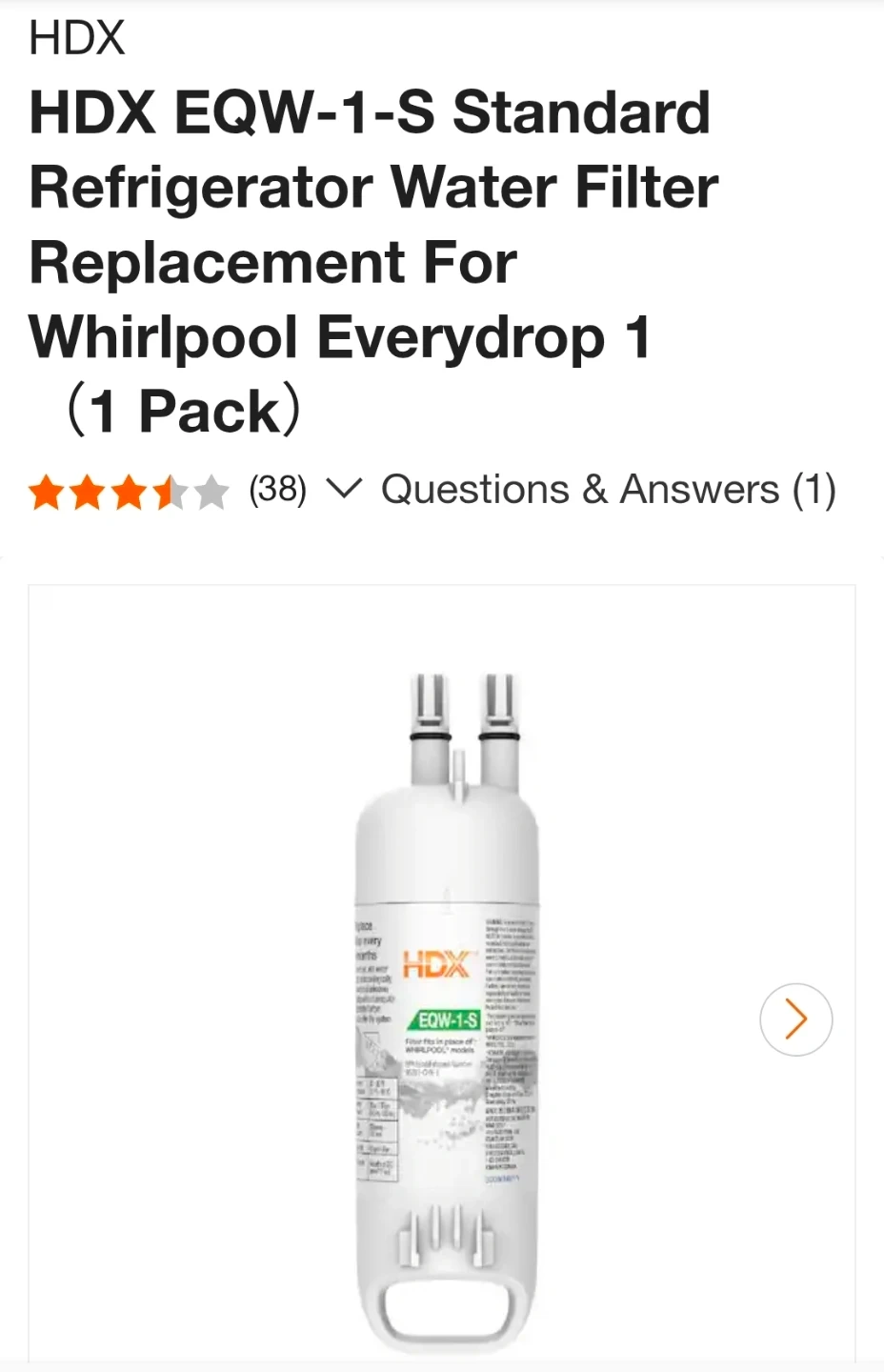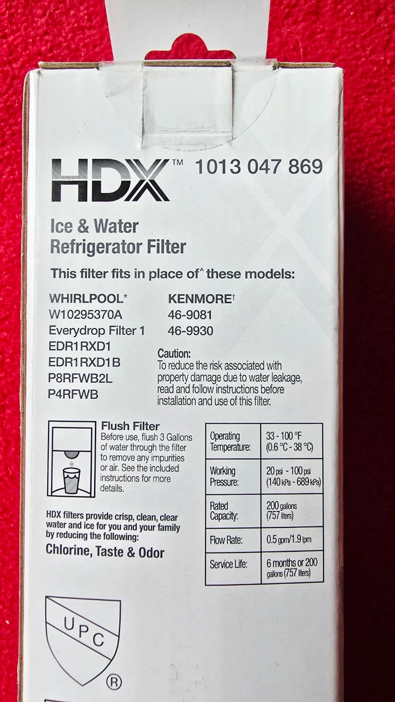 This HDX Ice & Water refrigerator filter fits in place of Whirlpool W10295370A, Filter 1, EDR1RXD1, EDR1RXD1B, and P4RFWB.