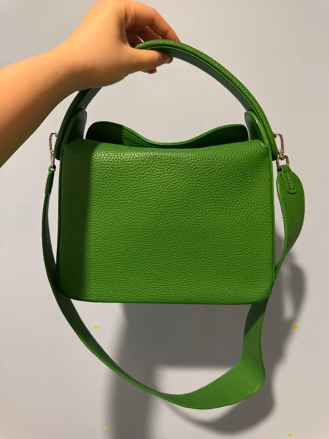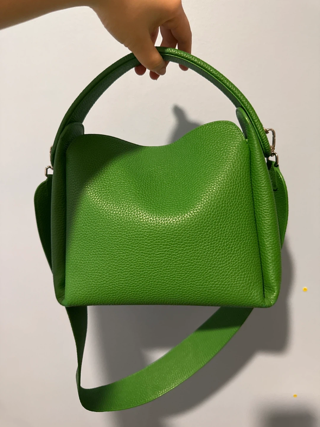 This is a green pebbled leather handbag. It has a top handle and a detachable shoulder strap. Interior has a main and spacious compartment.
