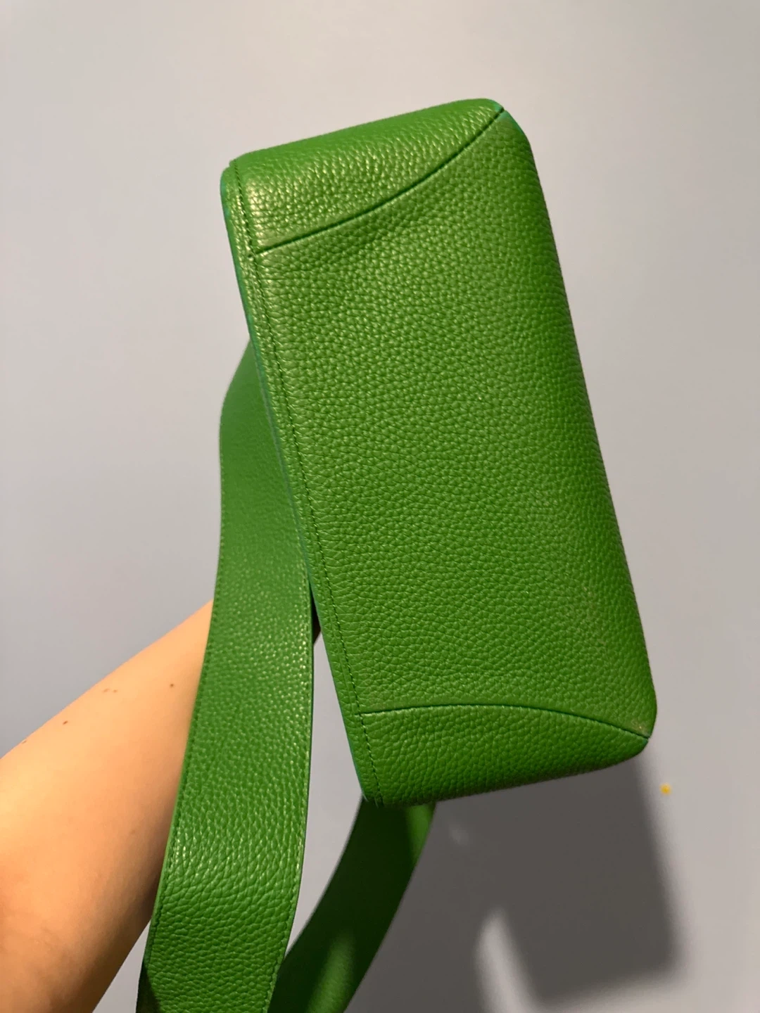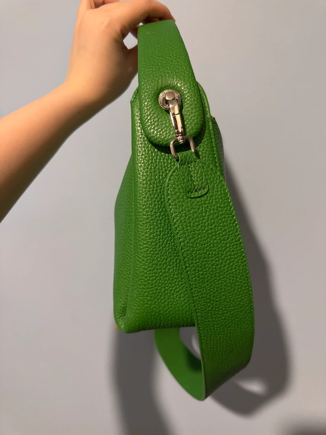 This is a green pebbled leather handbag. It has a top handle and a detachable shoulder strap. Interior has a main and spacious compartment.