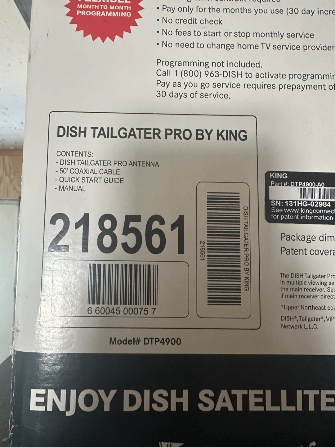 This KING Dish Tailgater Pro is a portable satellite TV antenna. It's designed for multiple TV viewing and features dual outputs for up to two receivers. The antenna is lightweight and compact, with an integrated carrying handle for easy transport. It's powered by a DISH HD solo receiver and includes a 50' coaxial cable and quick start guide.
