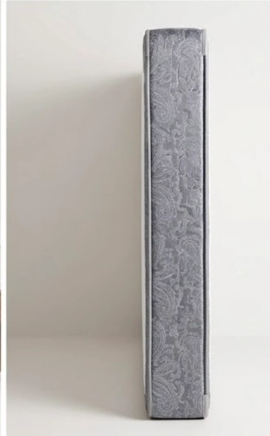Selling a high-quality, King Size Box Spring in excellent condition. It features a durable wood/steel frame construction with a modern grey paisley fabric finish and reinforced corner guards for extra protection.