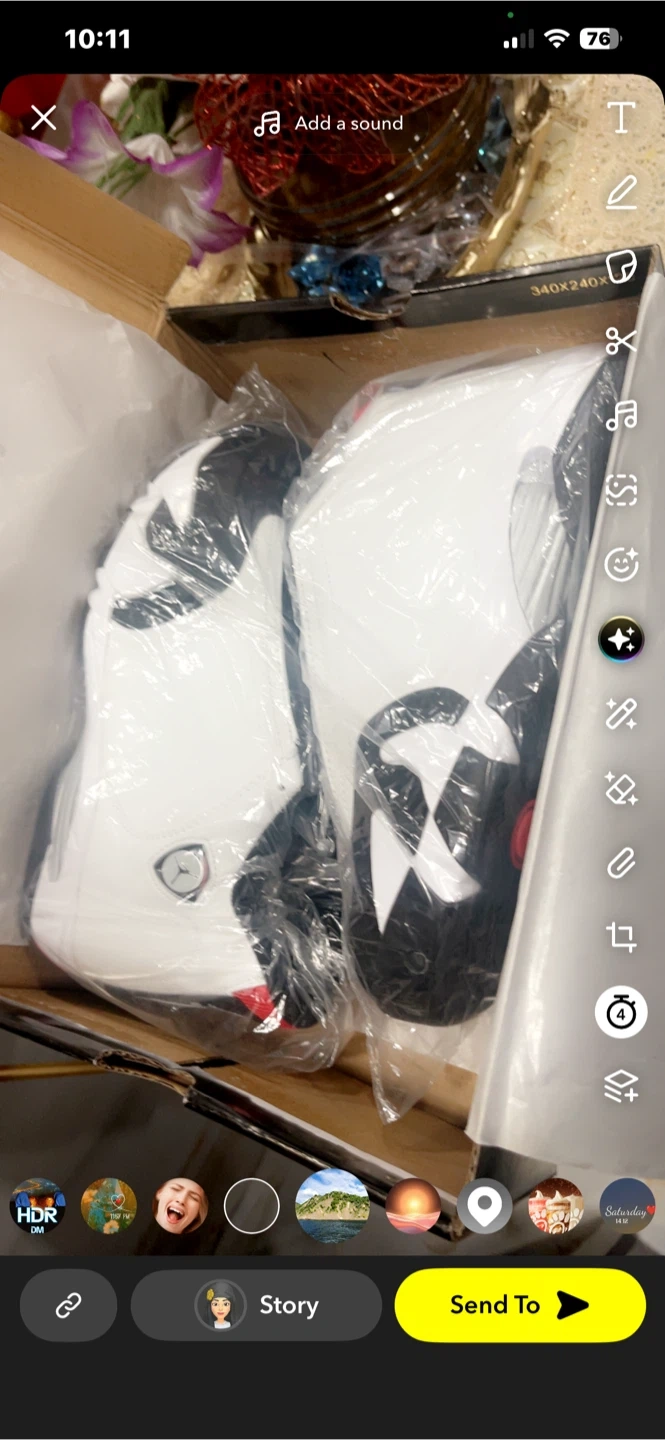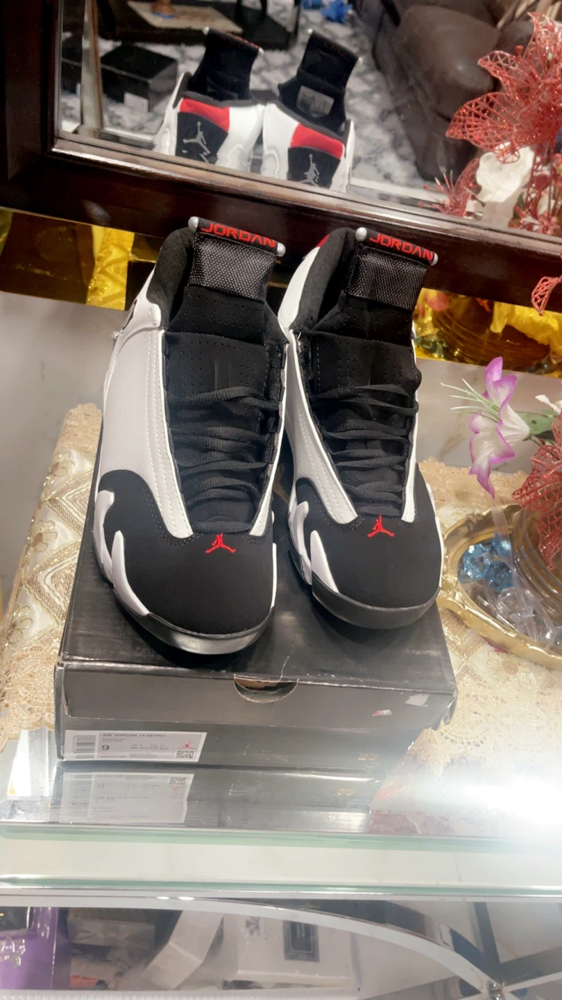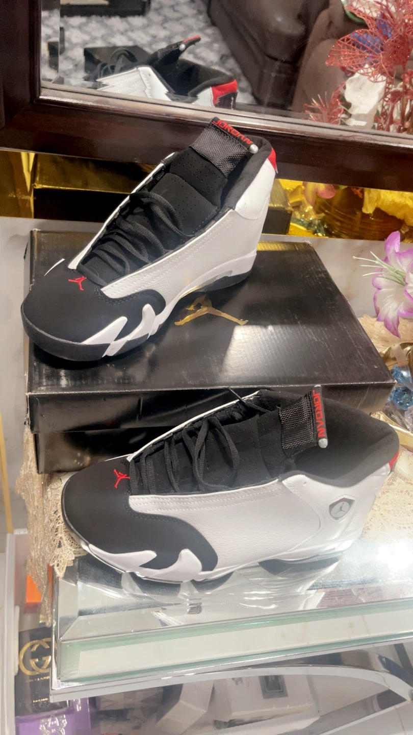 These are a pair of Air Jordan 14 Retro sneakers in a white, black, and red colorway. Includes original box. Size 8, 9, 10, 11