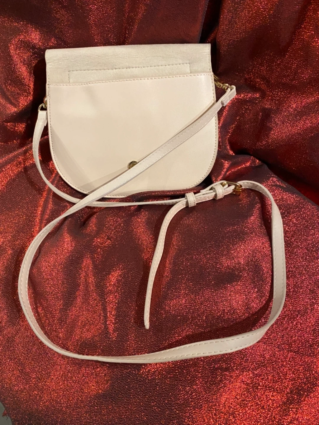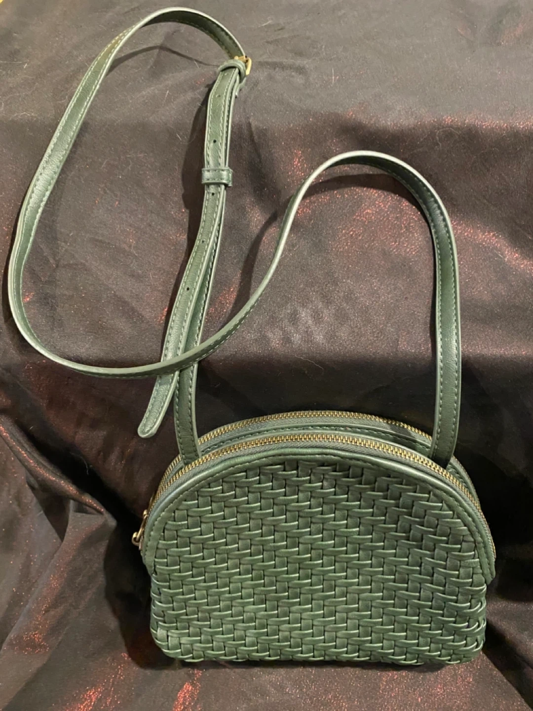 Cute crossbody bags. Genuine leather. Green - has a woven pattern on the front and a smooth back. The inside has two compartments with 2 top zippers and an inside pocket. Total of 3 sections. Middle section snaps close. Beige - 2 compartments. Snap closure.