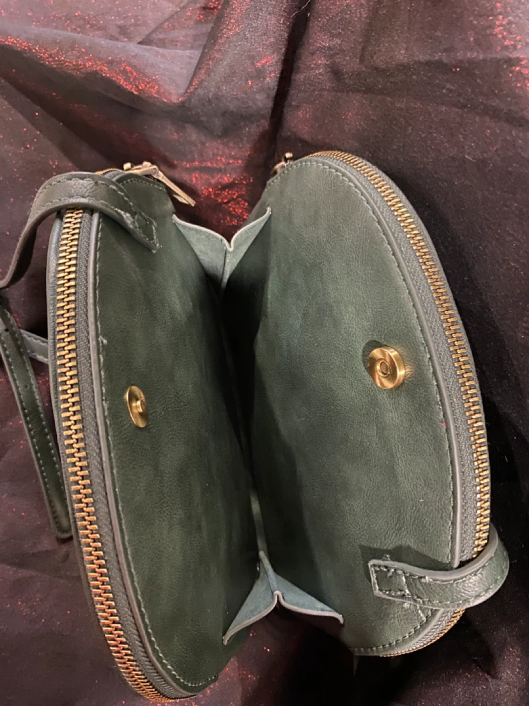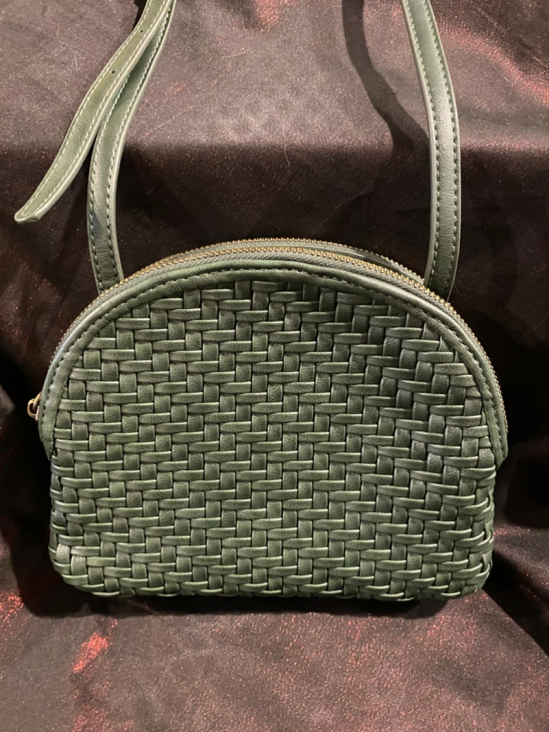 Cute crossbody bags. Genuine leather. Green - has a woven pattern on the front and a smooth back. The inside has two compartments with 2 top zippers and an inside pocket. Total of 3 sections. Middle section snaps close. Beige - 2 compartments. Snap closure.
