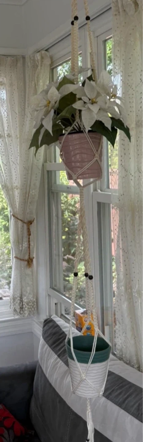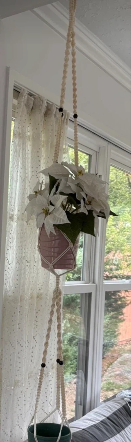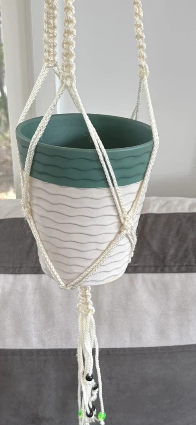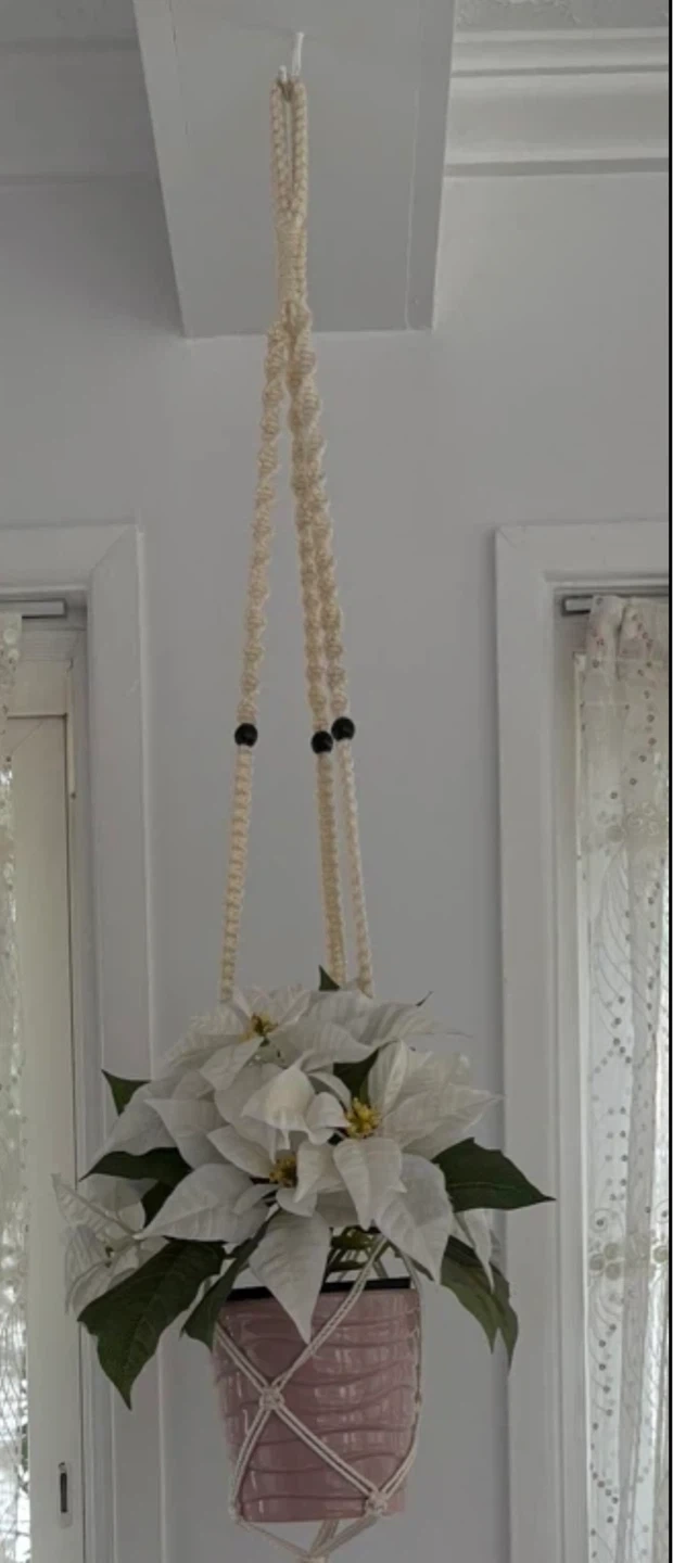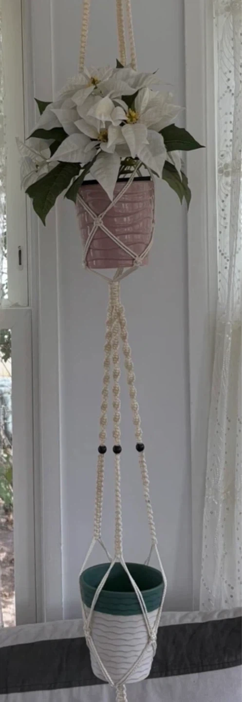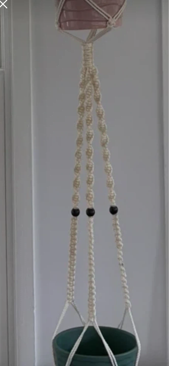 This is a handmade macrame plant hanger. It's made of White colored cord and features decorative black beads. The hanger It consists of two sections, which means you can place two pots. and designed to hold a medium-sized pot. It's perfect for displaying your plants!